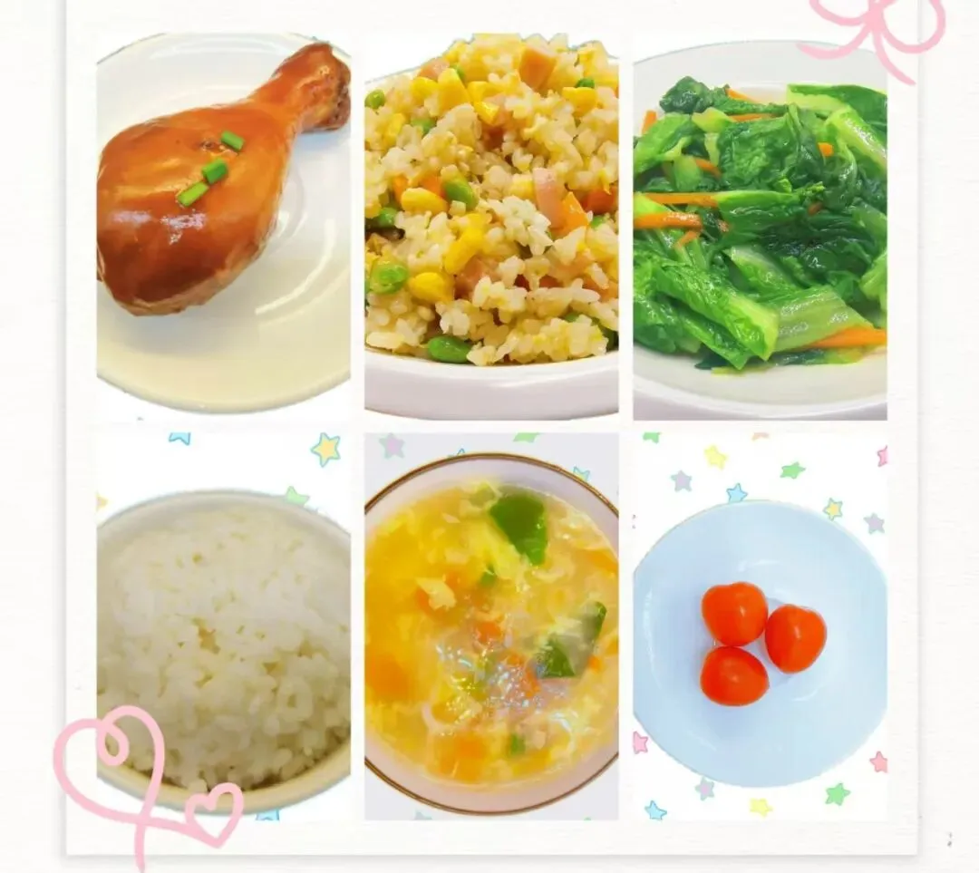 什锦炒饭:鸡蛋30g,胡萝卜末20g,玉米粒20g,青豆20g,香葱末5g,培根丁30g;