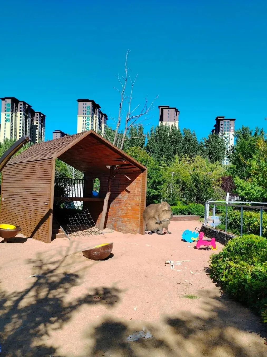 孩子们可以在专门的木屋滑滑梯乐园玩耍,也可以顺着河岸往南三环方向,到那水流平缓、河床布满鹅卵石的浅滩处,体验摸鱼的童年乐趣。