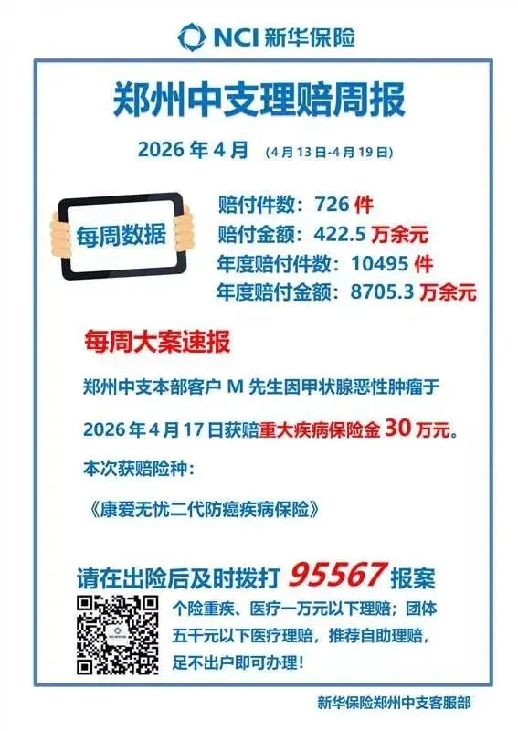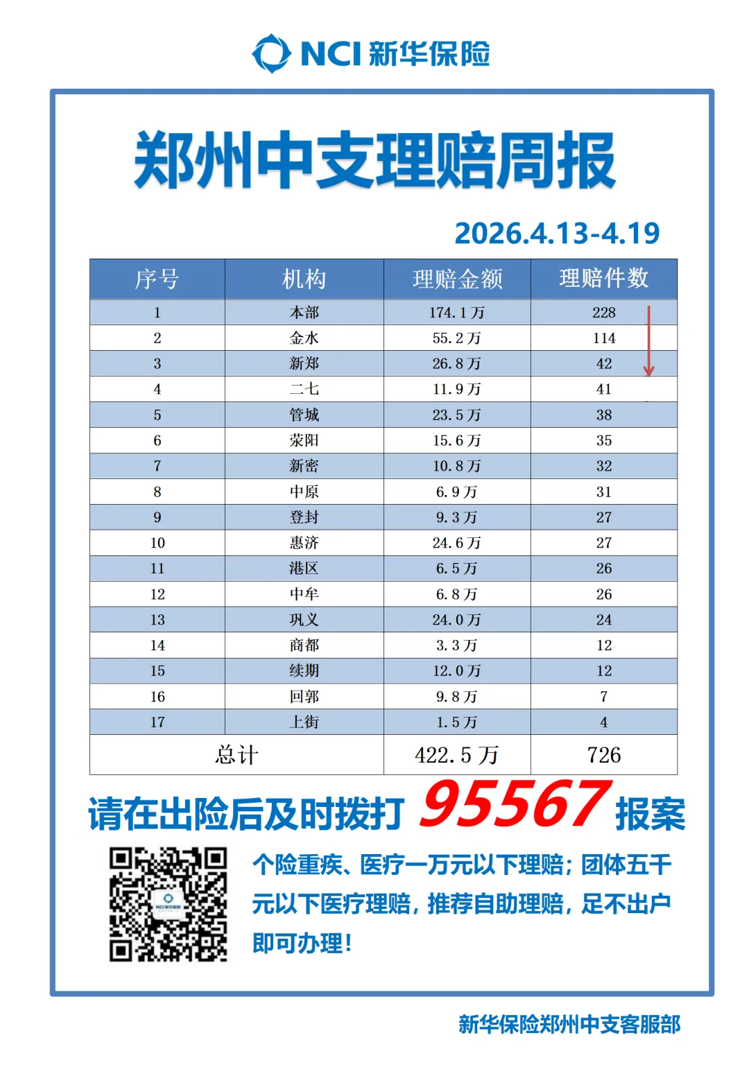 2026年4月13日至4月19日赔付726件,赔付金额422.5万余元。