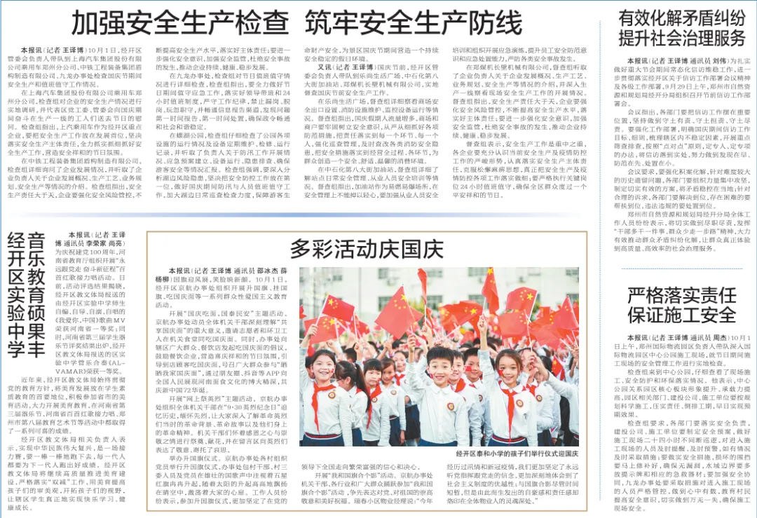 国庆节前,经开区管委会负责人带队到乐尚生活广场、中石化第八大街加油站、郑煤机长壁机械有限公司,实地督查国庆节前安全生产工作。在乐尚生活广场,督查组详细察看商场安全出口设置、消防设施维护、监控设备运行等情况。督查组指出,国庆假期人流量增多,商场和商户要牢固树立安全意识,从严从细抓好各项防范措施,把责任落实到每一个环节、每一个人,强化巡查管理,及时查改各类消防安全隐患,把安全措施落实到经营全过程、各环节,为群众创造一个安全、舒适、温馨的消费环境。