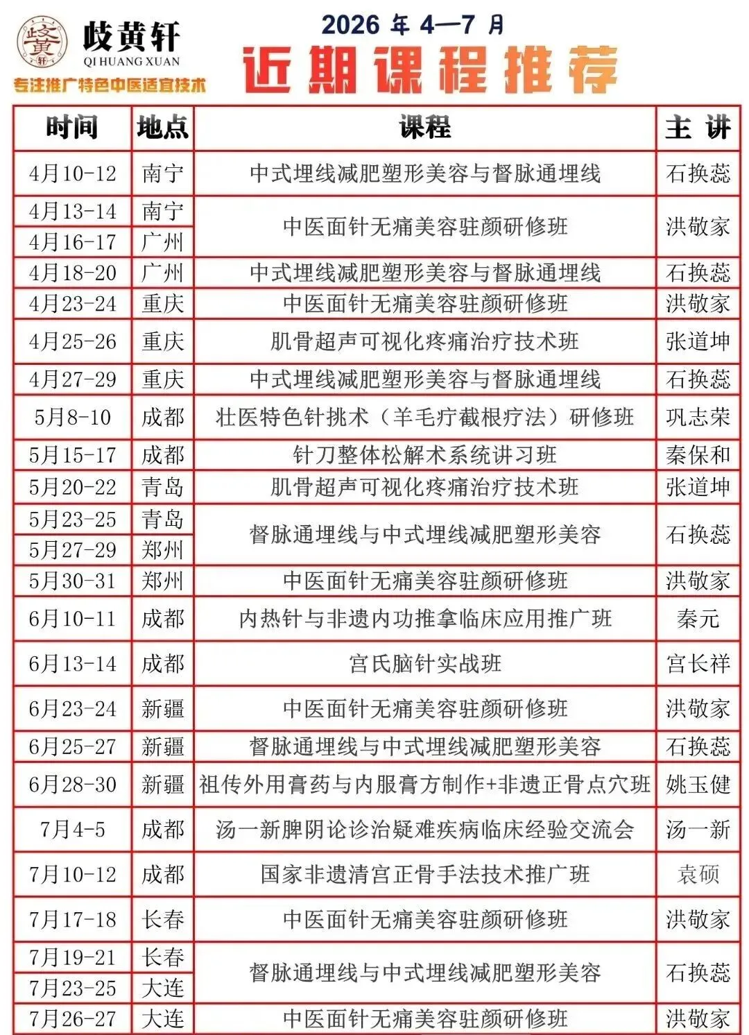 《肥胖症诊疗指南(2024年版)》中强调,肥胖症是多种慢性疾病的重要致病因素,规范化与系统化的临床诊疗对于提升国民健康水平至关重要。为贯彻落实国家卫健委启动2024—2027“体重管理年”行动,进一步推广卫生部十年百项推广项目——穴位埋线疗法,传授微创埋线疗法相关新理论和新技术,从而有力推动基层医疗事业的快速发展,更好地为患者服务。四川省中医药信息学会经研究决定于2026年5月下旬分别在青岛和郑州举办“中式埋线减肥塑形美容与督脉通埋线治疗慢性病研修班”。