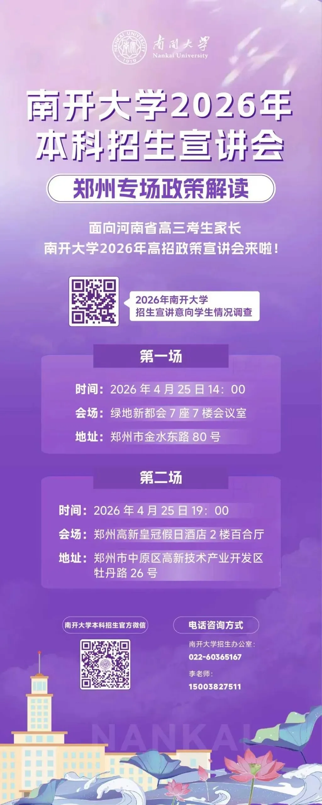 为帮助河南考生和家长全面了解南开大学2026年本科招生政策、专业设置、录取规则,南开大学将于4月25日(本周六)举办本科招生宣讲会郑州专场,面对面为大家答疑解惑!