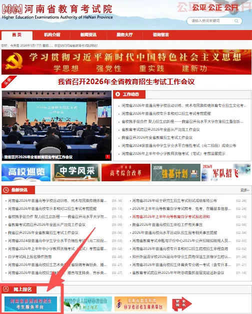 点击进入河南省教育考试院官网,点击如下图示位置,进入“河南省普通高校招生考生服务平台”(https://pzwb.haeea.cn/)系统。