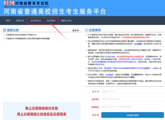 进入考生服务平台后,请仔细阅读“信息公告”区、“注意事项”区发布的政策公告和注意事项。