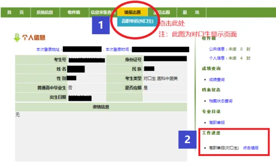 志愿保存成功,菜单“填报志愿”会变成“浏览志愿”,工作进度的“点击填报”会变成“点击查看”,同时,工作进度下方的收件箱--个人信息中会收到一条信息。