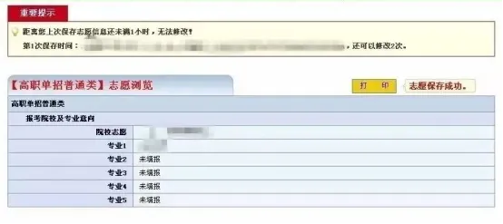 志愿保存成功后,系统自动跳转到志愿信息浏览页面,显示考生已填报的志愿信息,考生可以点击打印按钮打印志愿信息。
