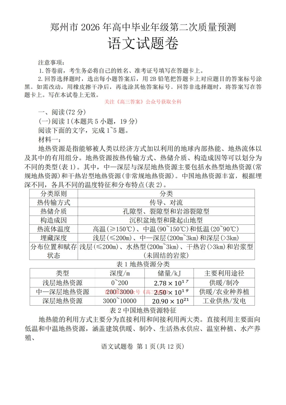 【郑州二模】郑州市2026年高三第二次质量预测语文、数学英语官方答案