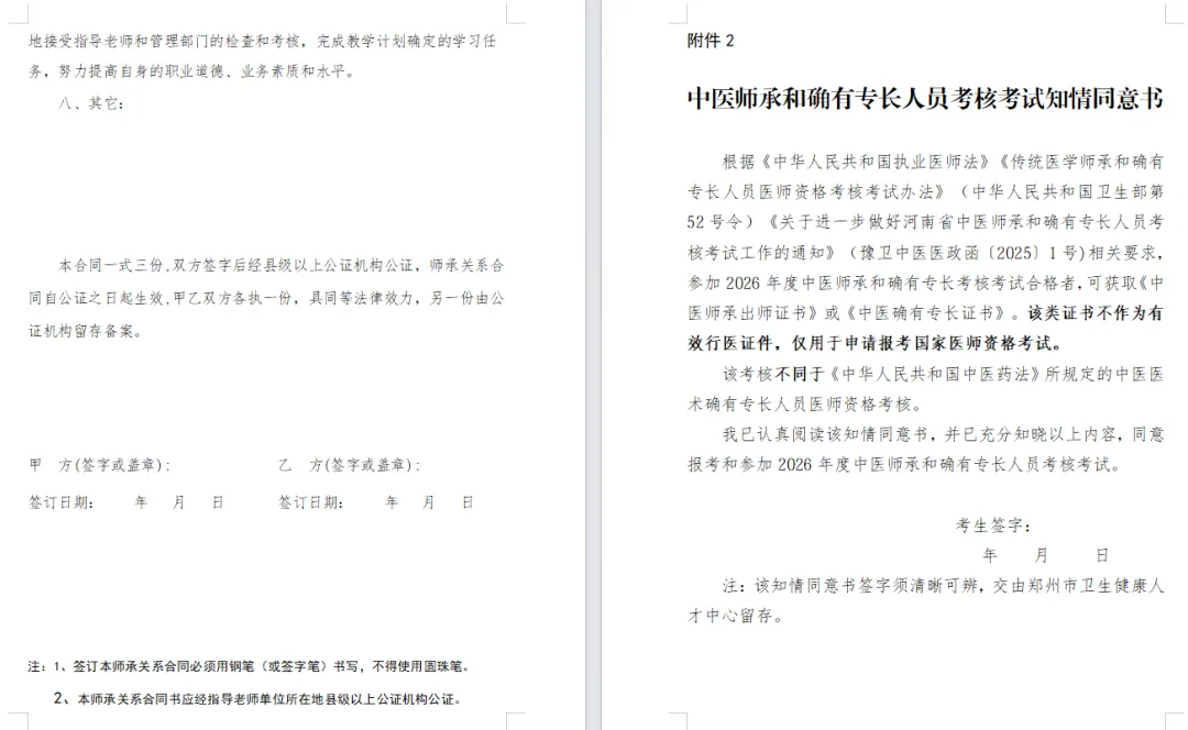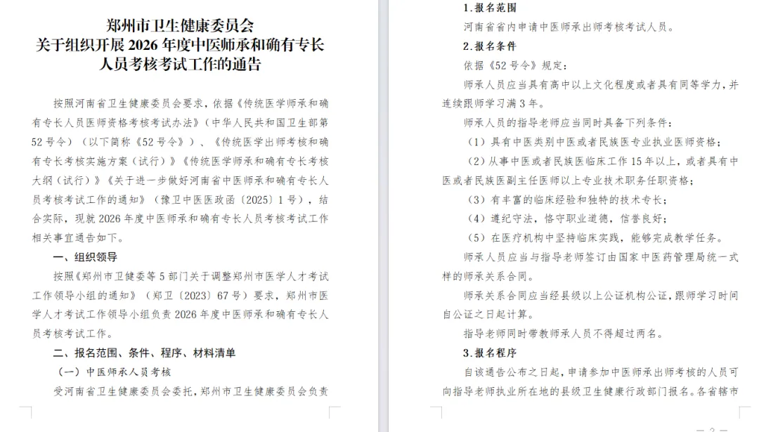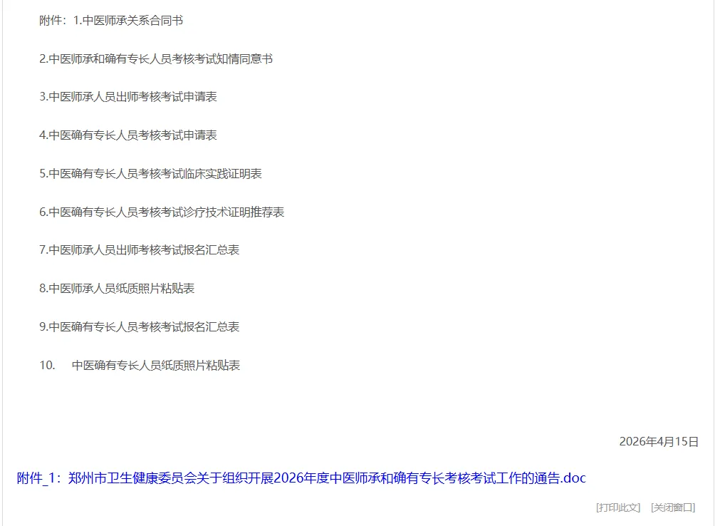 >郑州市2026年度中医师承和确有专长人员考核报名相关材料(52号令)