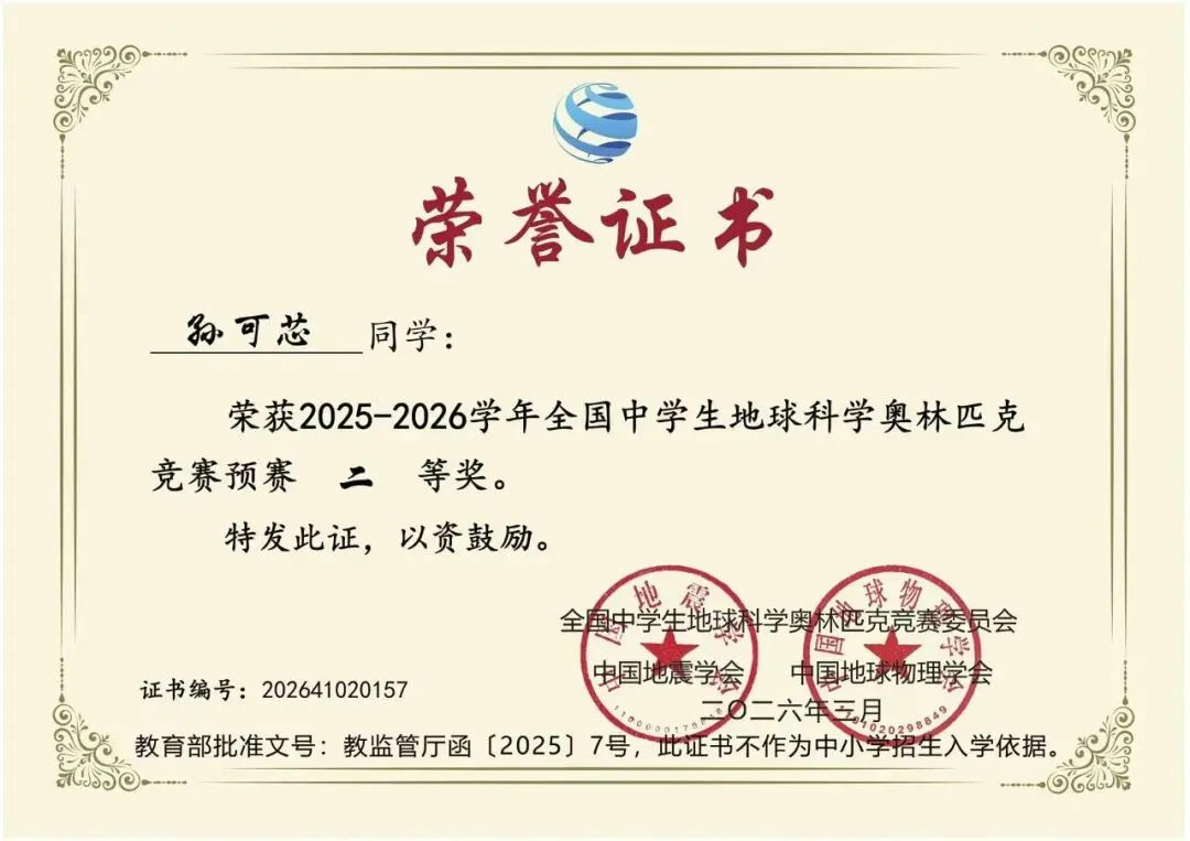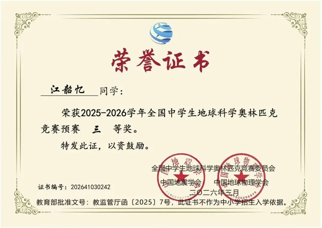 未来,学校将继续锚定拔尖创新人才培养目标,持续完善课程体系与实践平台,为更多学子提供广阔的成长舞台。希望四位获奖同学以此为新的起点,保持对地球科学的探索热情,在未来的学习和竞赛中再攀高峰!也希望全校同学以他们为榜样,勇于挑战自我,在各自热爱的领域发光发热,共同书写港外更加辉煌的明天!