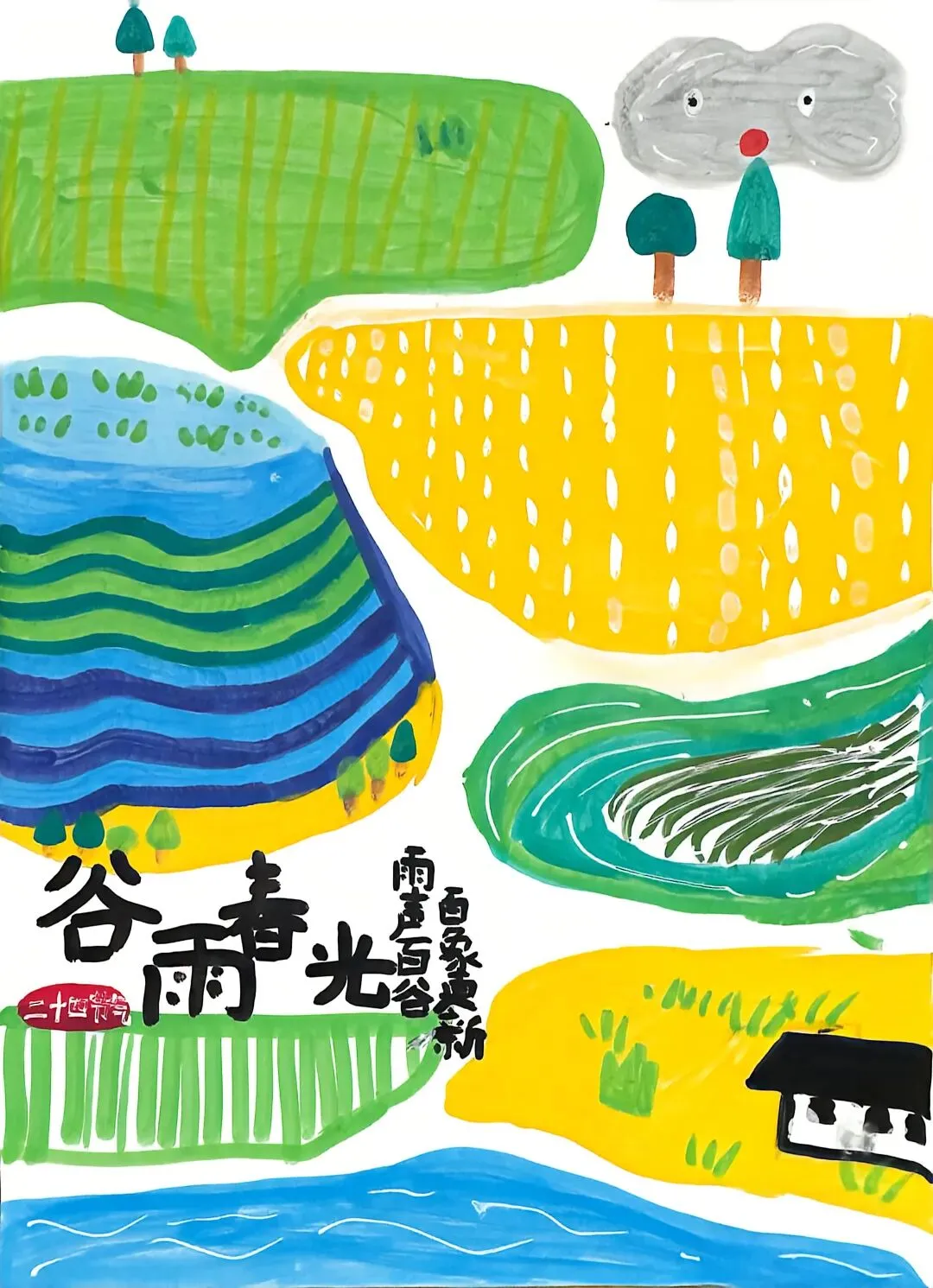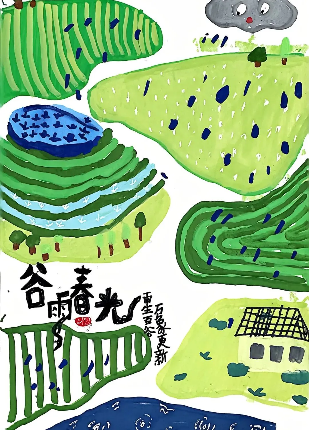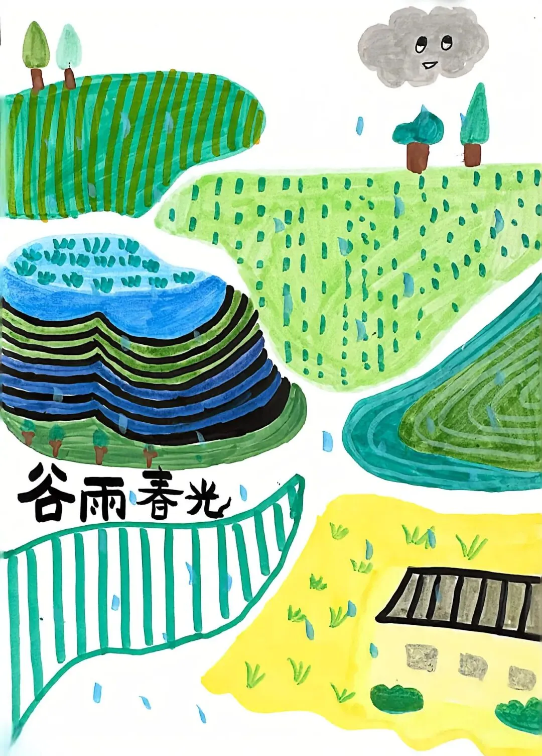 本次三年级小朋友以中国传统二十四节气中的“谷雨”为灵感,通过视觉艺术展现此时节的自然风貌与人文情怀。作品聚焦春雨润物、农耕繁忙、万物生长的景象,传递人与自然和谐共生的东方智慧。作品不仅呈现谷雨的物候特征,更通过艺术化表达传递中国传统农耕文化对天时的敬畏,以及“春雨贵如油”的生命哲学。