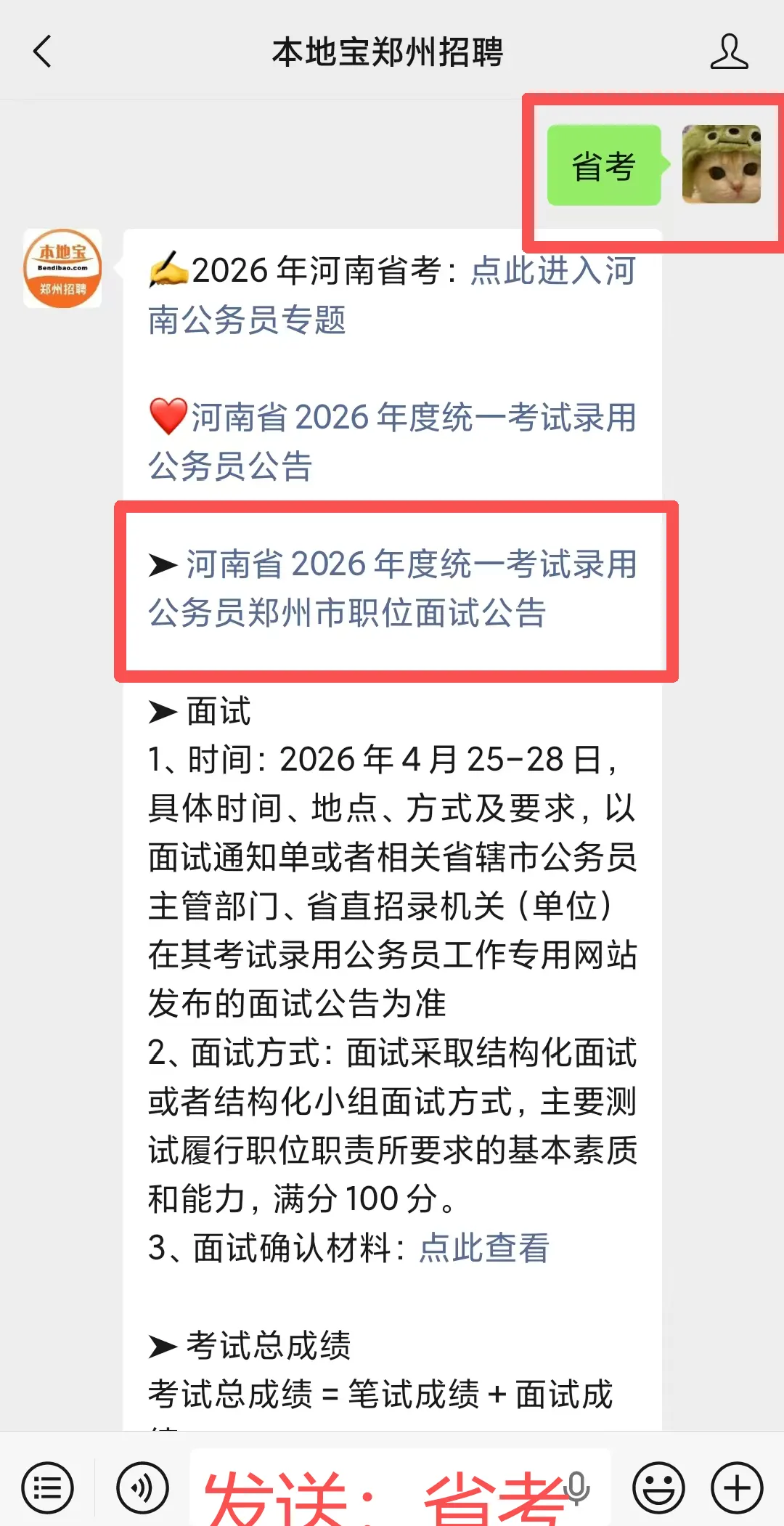 推荐服务:扫描下方二维码关注【本地宝郑州招聘】微信公众号并在对话框发送【省考】即可获取详细公告内容、面试名单、承诺书等