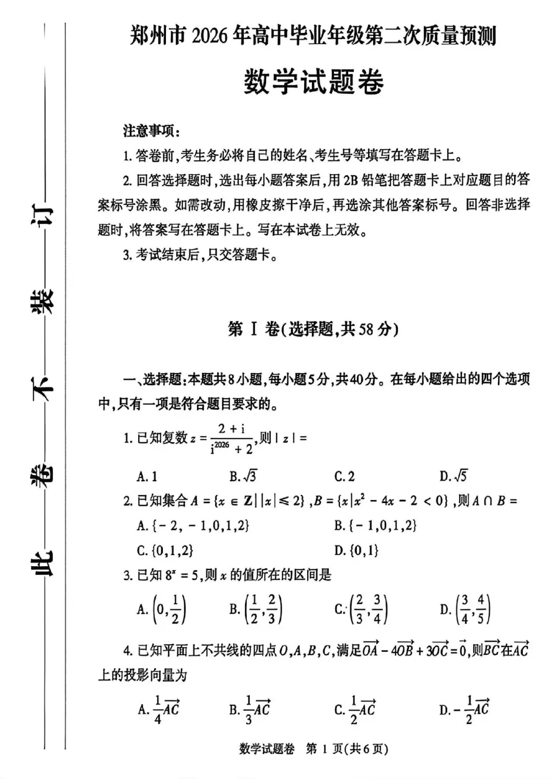 【郑州二模】郑州市2026年高三第二次质量预测《数学》《语文》试卷+答案下载