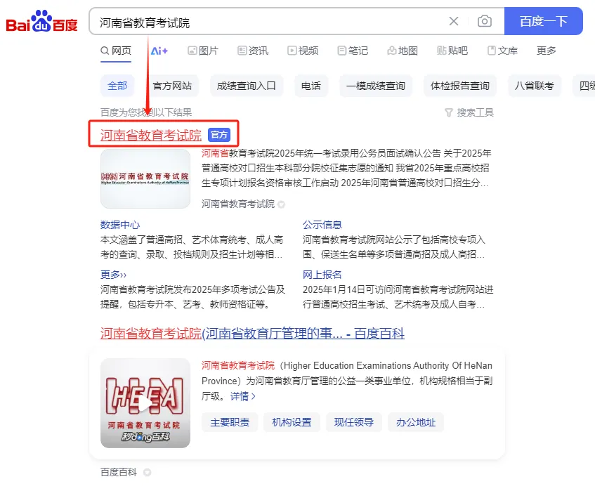 考生登录河南省教育考试院官网(http://www.haeea.cn/),或在搜索引擎中输入“河南省教育考试院”,点击带有“官方”标识的网站。