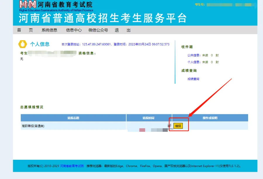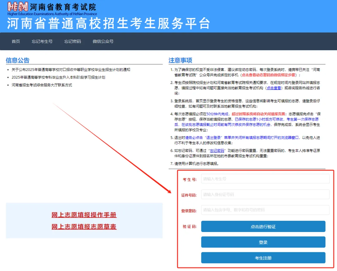 点击跳转进入河南省教育考试院官网,点击如下图示位置,进入“河南省普通高校招生考生服务平台(https://www.haeea.cn/)。
