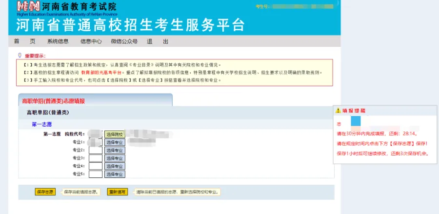 考生可填写1个院校,1-5个专业,填写完成后点击保存志愿;填报共有2次修改机会,以网上最后一次保存的志愿为准,填报时间截止后将无法补报和更改。