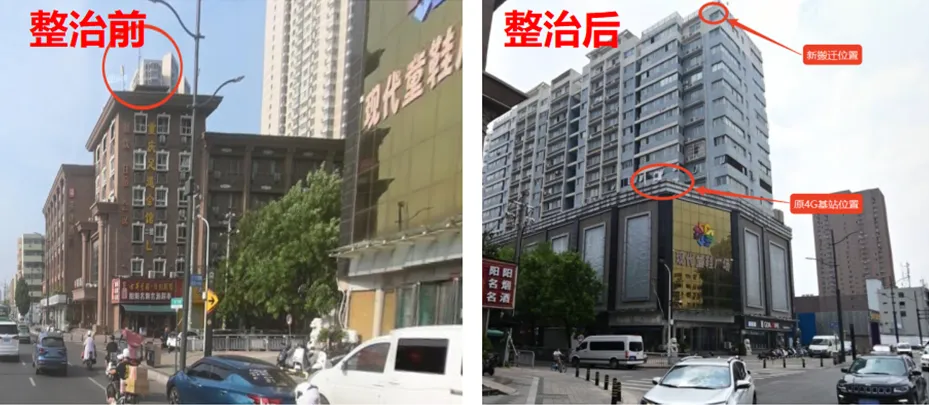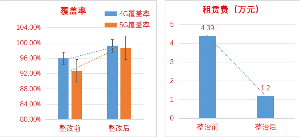为破解这一难题,二七区分公司多番勘察协调,精准制定整改方案,最终在周边楼宇现代童鞋城楼顶新建抱杆站,将原双基站整合搬迁至顶楼楼面。整改后天线挂高达50米,较之前提升25米,彻底补齐覆盖短板,实现区域覆盖均衡达标。网络覆盖大幅提升,4G MR覆盖率从95.95%跃升至99.24%,5G覆盖率从92.63%提升至98.75%;业务量显著增长,5G日均流量增幅182%,4G日均流量增幅92.6%;用户投诉明显压降,相关不达标栅格全部完成整改。年租金从4.39万元压降至1.2万元,年节约成本3.19万元,实现精益降本。