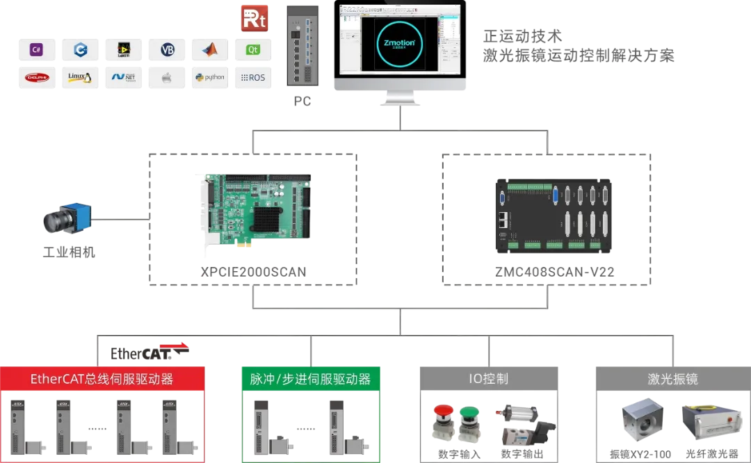 主要面向高速、精细、小范围或柔性图形的常规激光加工与激光+振镜扫描应用场景。可实现激光与振镜信号的高速、精准同步控制。产品兼容主流脉冲/连续激光器(光纤、CO2、紫外等),并支持振镜XY2-100控制协议。(XPCIE2000SCAN带视觉定位功能,需配合MotionRT750一起使用)