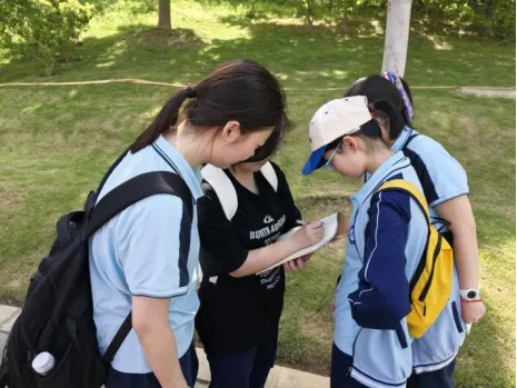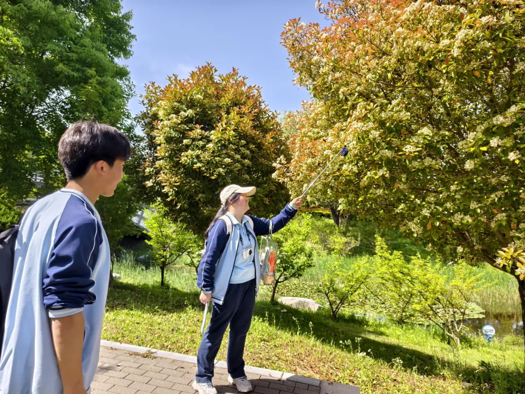 部分班级开展“园林里的生物课堂”实践活动,大家对照图鉴认真识别植物种类、观察叶片形态、记录生长特征,将课本知识与实景观察相结合,在自然中完成生动的生物学科实践学习。