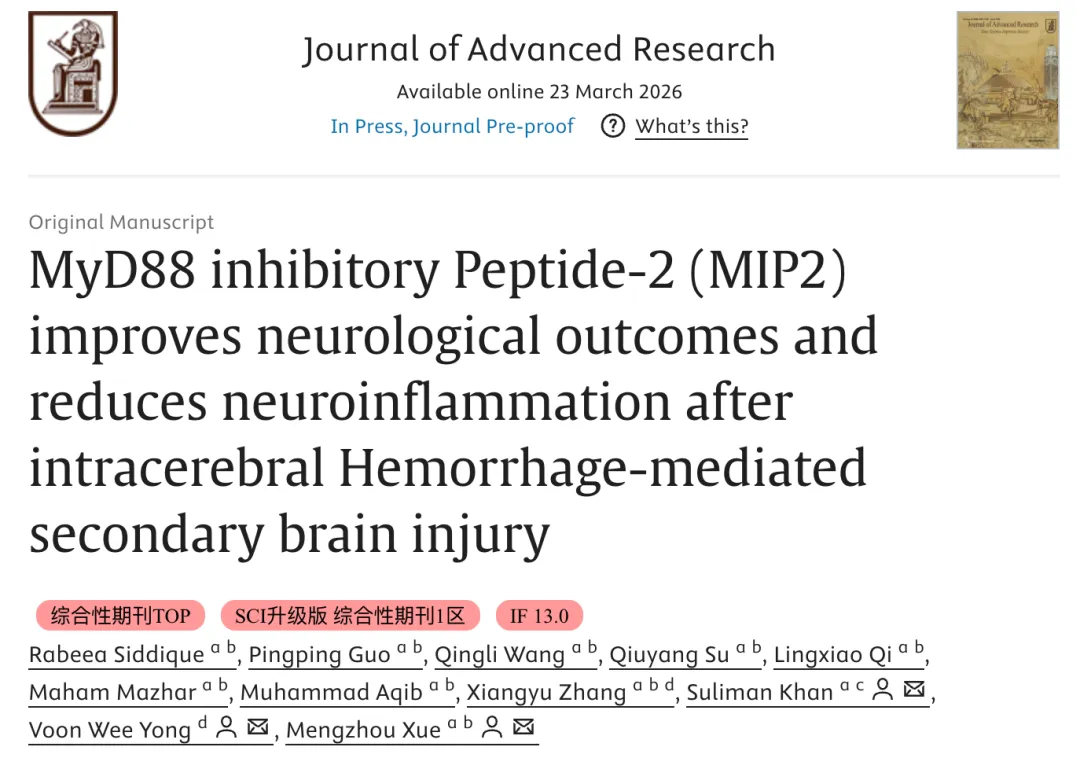 各位热爱科研的小伙伴们,今天为大家推介2026年3月23日发表在 《Journal of Advanced Research》杂志的研究性文章。该文章由郑州大学 薛孟周教授等团队共同完成,主要研究方向为探索脑出血脑损伤发病的分子生物学机制、脑梗死后出血转化机制及其防治探讨、探索代谢性疾病与脑血管病之间相互作用及影响、微创治疗脑出血新方法、干细胞修复脑出血脑损伤、纳米技术在脑血管病治疗中的应用、中医中药在脑血管病防治中的创新研究等。文章题目“MyD88 inhibitory Peptide-2 (MIP2) improves neurological outcomes and reduces neuroinflammation after intracerebral Hemorrhage-mediated secondary brain injury”。本研究旨在研究MIP2针对脑出血诱导的继发性脑损伤的潜在神经保护、抗炎和抗氧化应激的治疗潜力,并且围绕脑出血 (Intracerebral hemorrhage)、继发性脑损伤 (Secondary brain injury)、神经炎症 (Neuroinflammation)、MyD88抑制肽-2 (MyD88 inhibitory peptide-2, MIP2)、分子调节 (Molecular regulations)等关键词展开研究。
