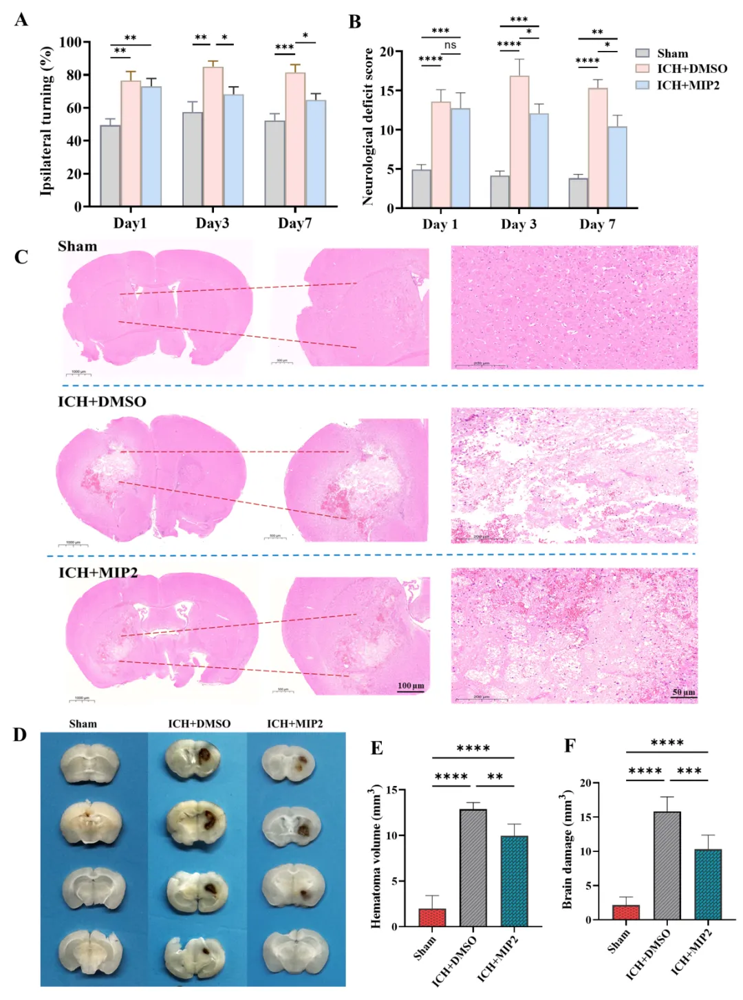 功能改善: MIP2治疗显著改善了神经功能,减少了血肿体积。