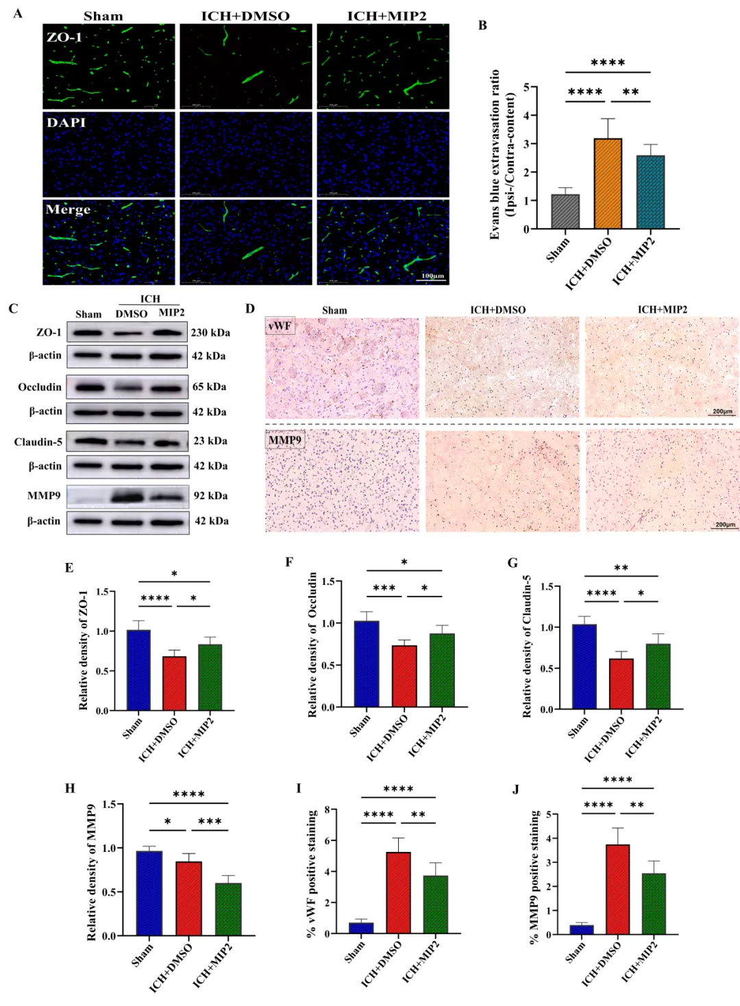 (A) 血肿周围脑区标记ZO-1(绿色)和DAPI(蓝色)的免疫荧光染色图像。(B) 伊文思蓝染色的定量分析。(C) 脑出血术后第3天紧密连接蛋白(ZO-1、Occludin、Claudin-5)及MMP9的代表性Western blot结果。(E–H) ZO-1(E)、Occludin(F)、Claudin-5(G)及MMP9(H)表达的定量分析。(D) 脑出血后血肿周围脑区vWF和MMP9免疫组化染色的代表性图像。(I)(J) vWF(I)和MMP9(J)的定量分析。