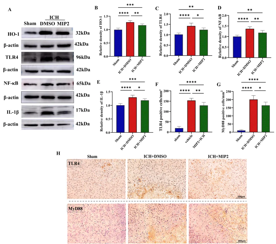(A) Western blot检测HO-1、TLR4、NF-κB及IL-1β的蛋白表达。(B–E) 通过ImageJ和GraphPad Prism软件对HO-1(B)、TLR4(C)、NF-κB(D)和IL-1β(E)进行定量分析。(H) 脑出血术后第3天TLR4和MyD88阳性细胞的免疫组化扫描图像。(F)(G) 通过ImageJ和GraphPad Prism软件对TLR4(F)和MyD88(G)进行定量分析。