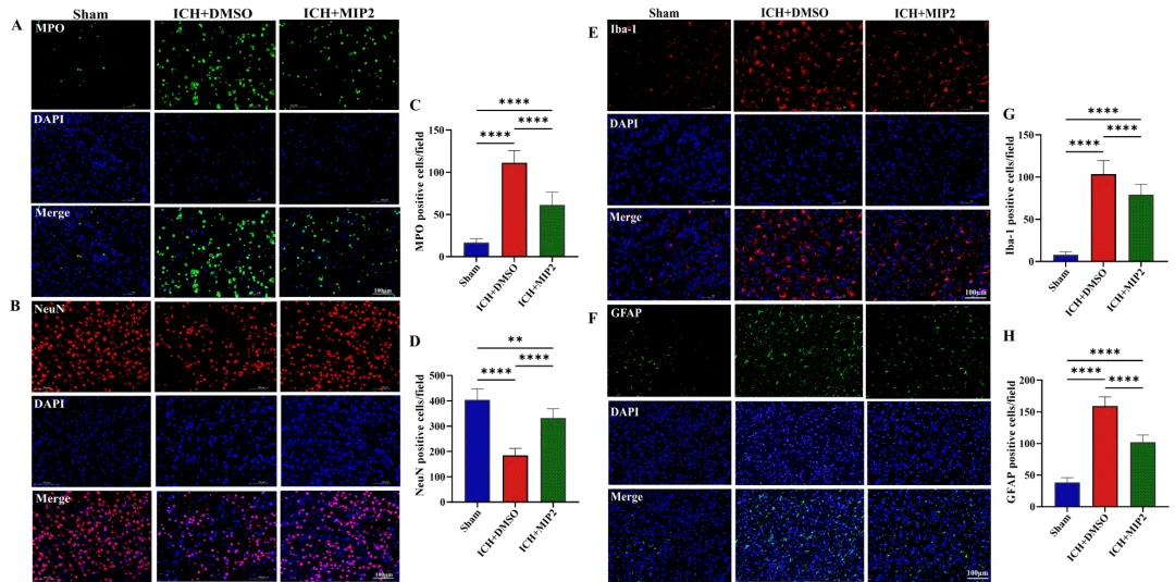 (A–D) 脑出血术后第3天MPO(绿色)、DAPI(蓝色)(A, C)及NeuN(红色)(B, D)的荧光染色及定量分析,通过ImageJ和GraphPad Prism软件分析。(E–H) 脑出血术后第3天Iba-1(红色)(E, G)和GFAP(绿色)(F, H)的荧光染色及定量分析,通过ImageJ和GraphPad Prism软件分析。