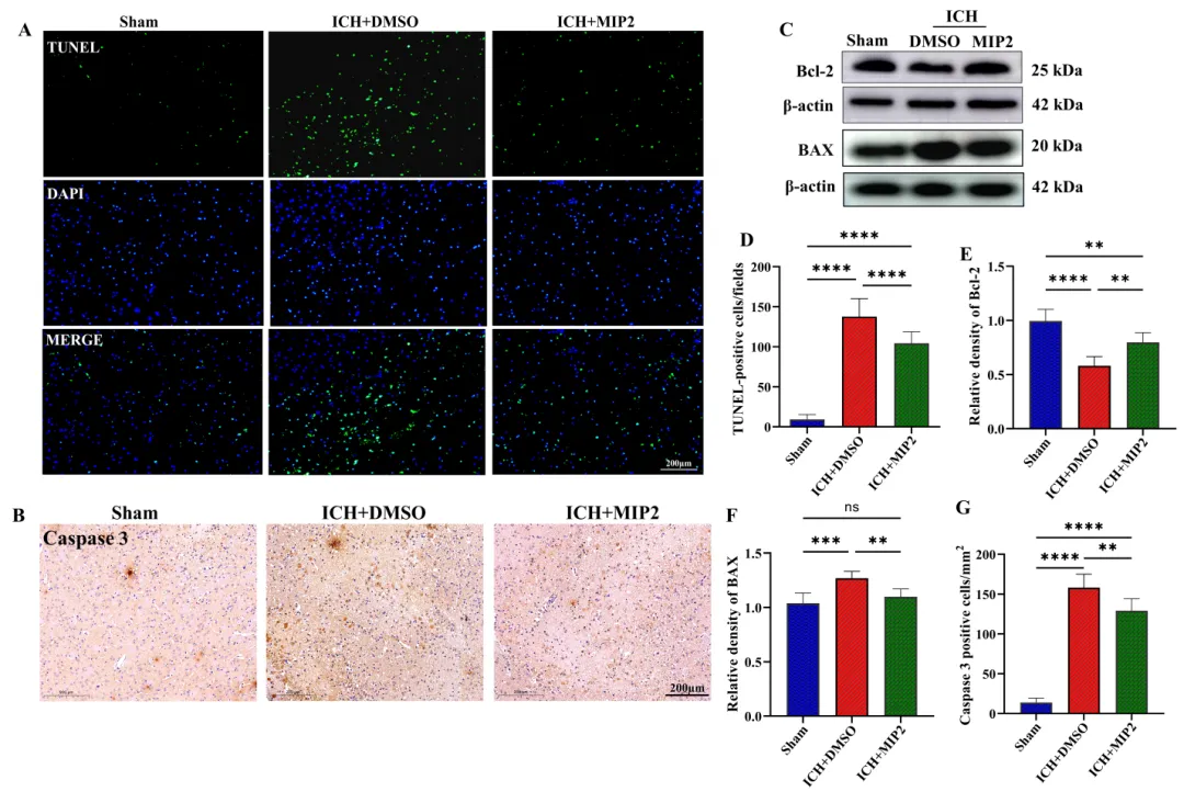 (A)(D) 脑出血术后第3天血肿周围区域TUNEL阳性细胞的代表性荧光图像及定量分析(TUNEL:绿色,DAPI:蓝色)。(B)(G) 免疫组化染色图像(B)及cleaved caspase-3的定量分析(G)。(C) Western blot检测Bcl-2和BAX的蛋白表达。(E)(F) Bcl-2(E)和BAX(F)的定量分析。