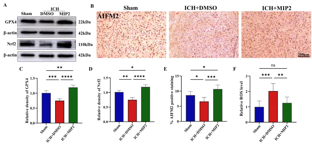 (A)(C–D) 脑出血术后第3天血肿周围脑区GPX4(A, C)和Nrf2(A, D)的蛋白表达。(B) AIFM2的免疫组化染色图像。(E) AIFM2阳性染色百分比的定量评估,数据通过ImageJ获取并由GraphPad Prism软件分析。(F) 活性氧检测。