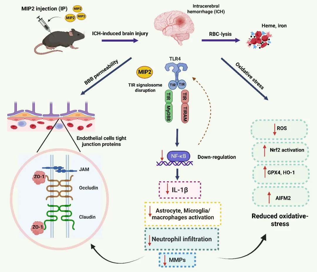 该图展示了MIP2腹腔注射后穿越血脑屏障,通过干扰TIR信号体组装(结合TLR4、MyD88的TIR结构域),抑制NF-κB激活和下游IL-1β释放,进而减少星形胶质细胞、小胶质细胞/巨噬细胞活化、中性粒细胞浸润和MMPs产生;同时激活Nrf2抗氧化通路,上调GPX4、HO-1和AIFM2表达,降低ROS水平,最终保护血脑屏障紧密连接蛋白(ZO-1、Occludin、Claudin-5、JAM),实现神经保护和功能恢复。