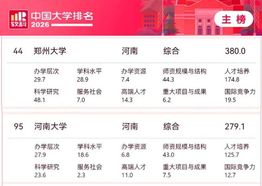 “2026软科中国大学排名”日前正式发布。清华大学、北京大学雄踞主榜(即综合性大学排名)前两位。河南两所高校进入排行榜前100,其中,郑州大学排名44、河南大学排名95。