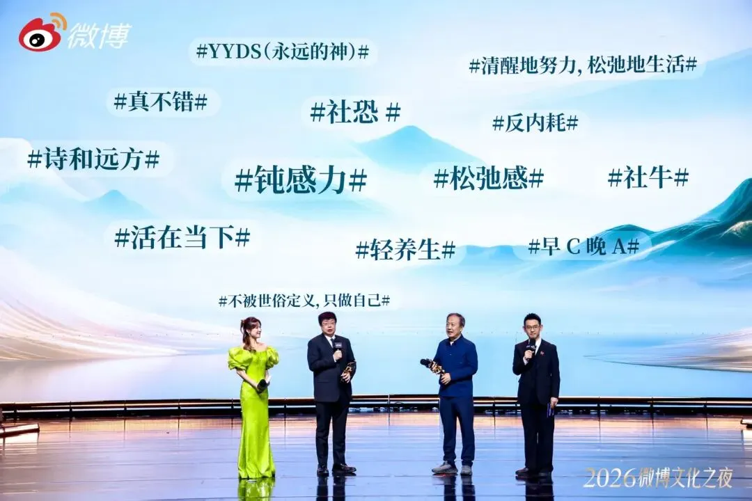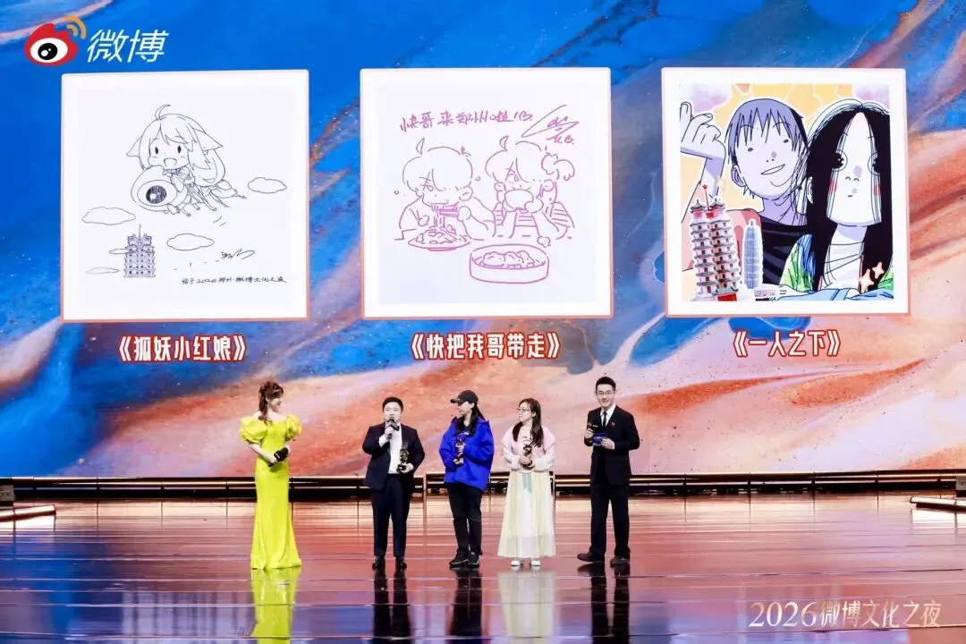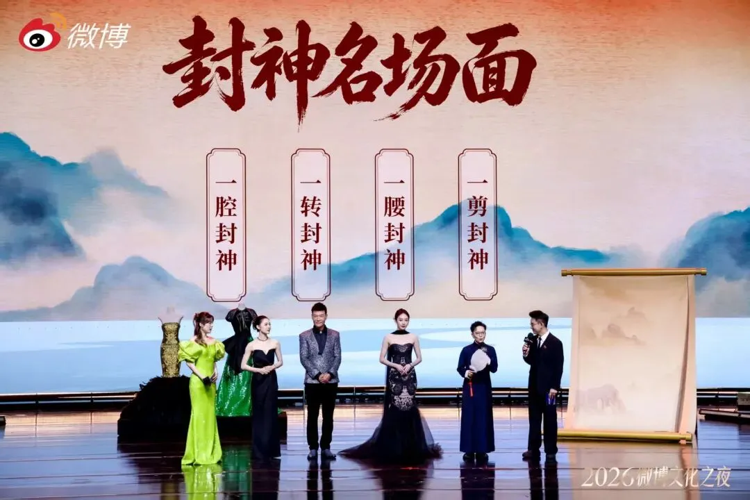 文化传承,生生不息。2026微博文化之夜现场先后颁出二十组重磅荣誉,年度原创文学IP、年度国漫IP、年度文化风尚人物、年度影响力作家等奖项同样熠熠闪光,从不同维度展现文化的赓续与创新。#张淇文化之夜再唱定军山#、#黄河诗词被刘钧演活了#、#一句诗词解构当代年轻人#等多个话题登上微博话题热搜。