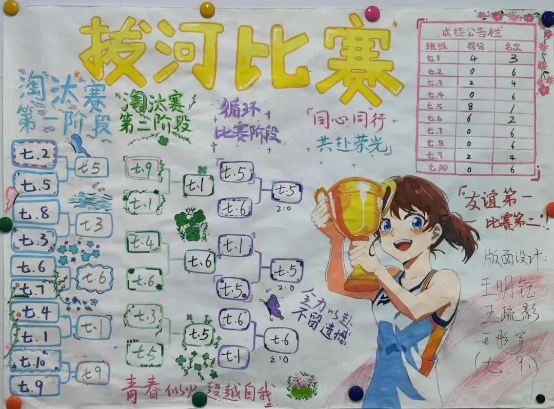 经过首轮激烈比拼,七(1)班、七(3)班、七(4)班、七(5)班、七(6)班、七(9)班成功晋级六强。其中,七(5)班以两局全胜、用时最短的优异表现成为夺冠热门。