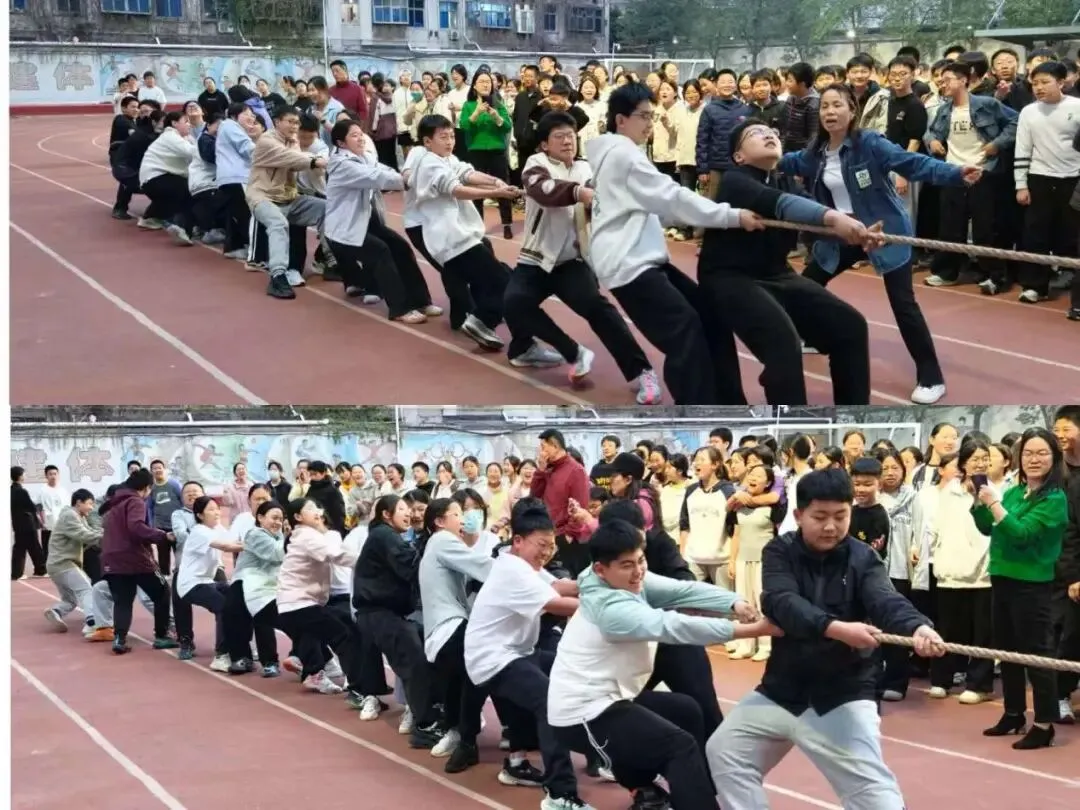 随着裁判一声哨响,首场比赛正式打响!队员们紧握长绳,双脚蹬地,身体后仰,齐声高喊“一二、一二”的口号,使出浑身解数将红绸向本方河界奋力拉去。赛场上,队员们个个面红耳赤,青筋暴起,却丝毫不肯松手;赛场边,班主任挥舞双臂指挥助威,啦啦队的加油声、呐喊声震耳欲聋。