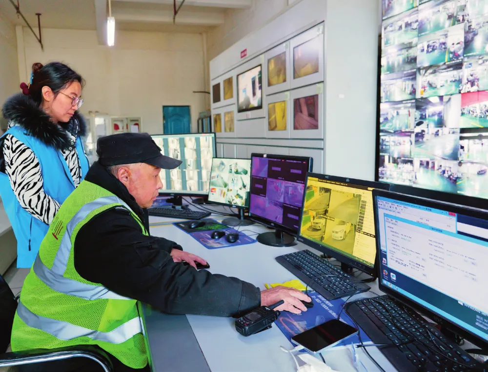 在郑州市秦江花园小区,秦岭路街道秦江社区的网格长(左)在查看小区安防监控(2024 年 11 月 28 日摄) 李嘉南 摄 / 本刊