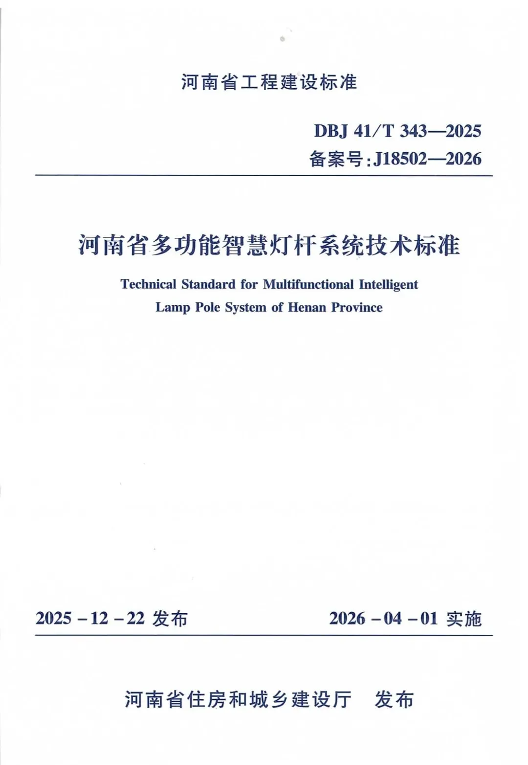 郑州市市政工程勘测设计研究院主编的《河南省多功能智慧灯杆系统技术标准》DBJ41/T343-2025正式发布,备案号:J18502-2026,自2026年4月1日起在全省施行。同时,郑州市政设计院参编两项团体标准也正式发布,多项标准成果密集落地,为智慧照明行业规范化、高质量发展筑牢坚实基础。