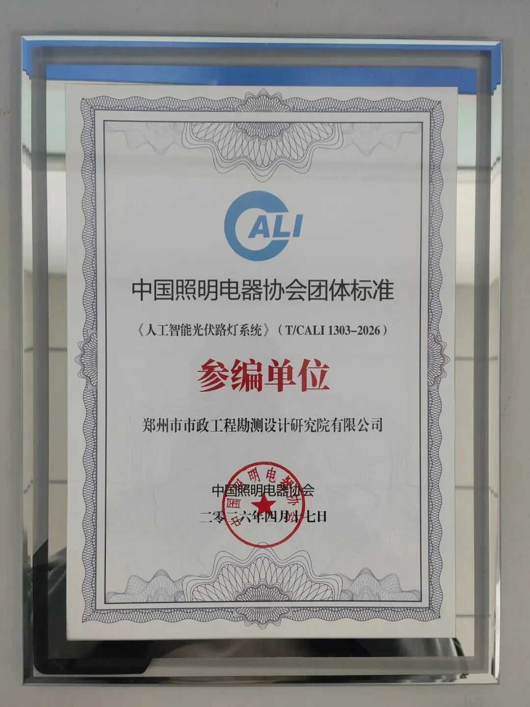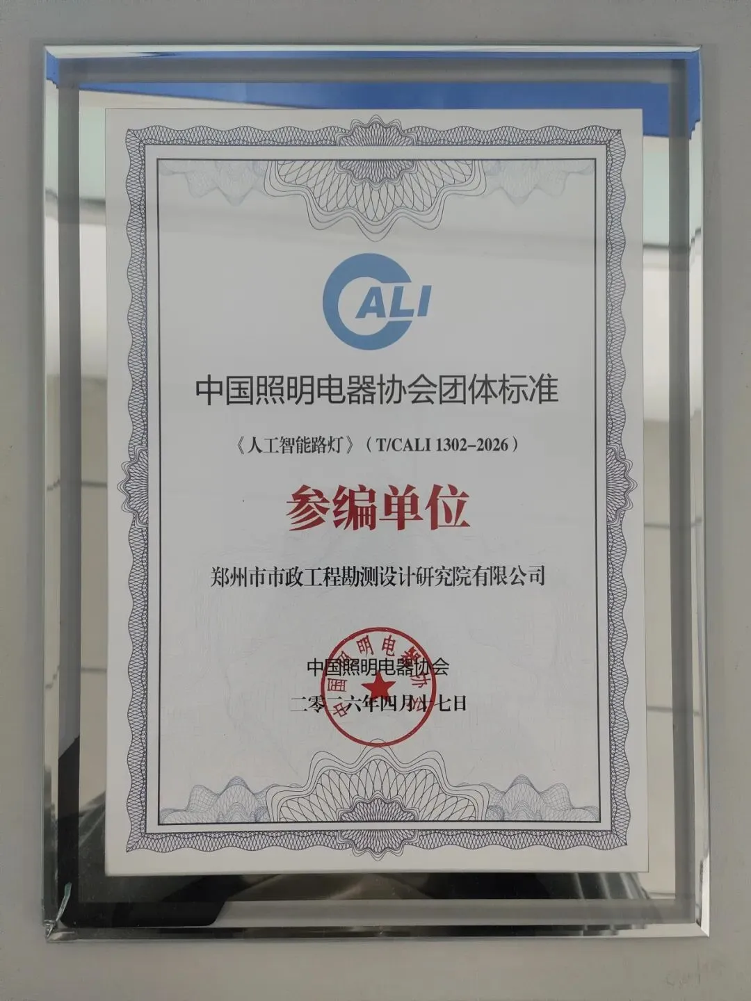 同期,郑州市政设计院参编的《人工智能路灯》(T/CALI1302-2026)、《人工智能光伏路灯系统》(T/CALI1303-2026)两项中国照明电器协会团体标准,于2026年4月17日在中国道路照明论坛隆重发布,实现地方标准与团体标准双向突破。