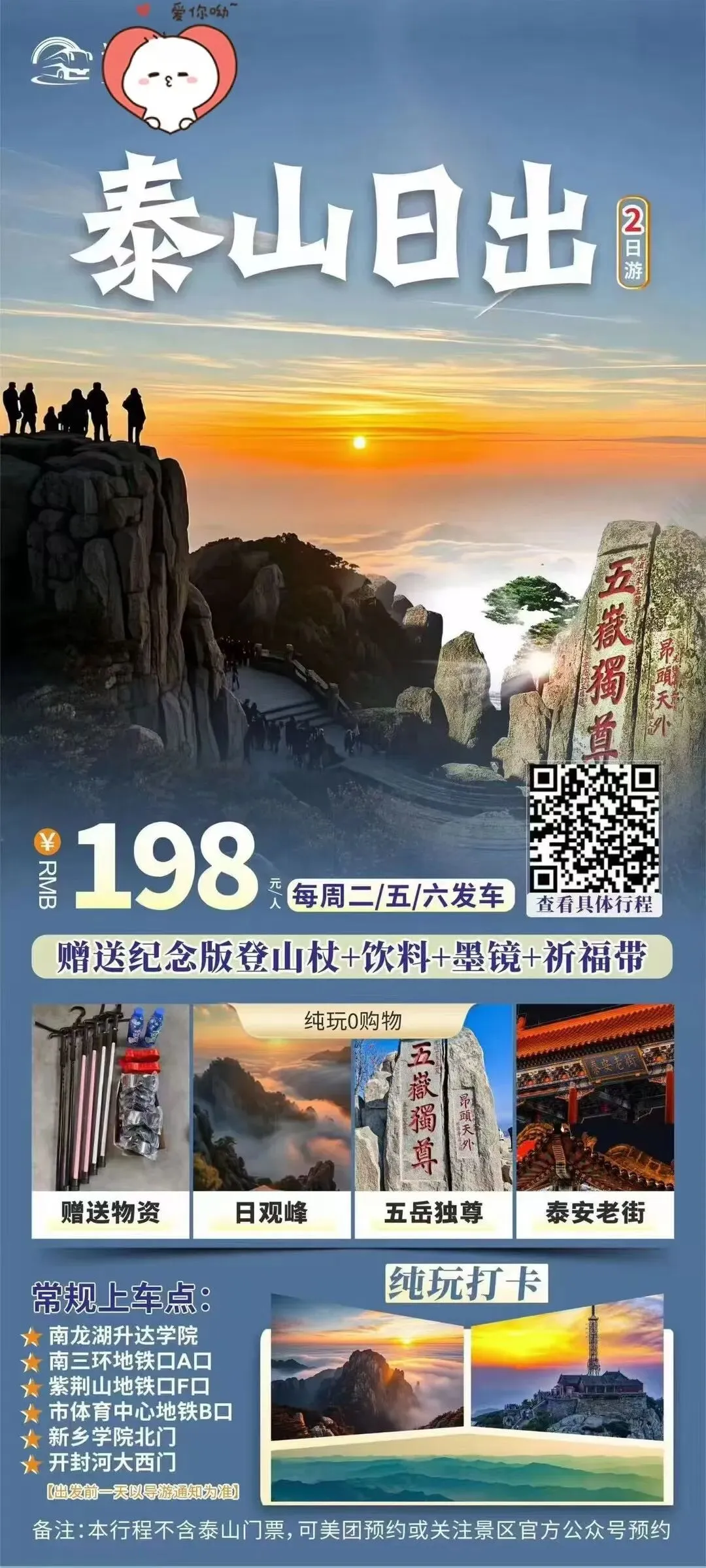 第一天:下午13点左右郑州各大地铁口集合赴好客山东-东岳泰安,车程大约6个小时,晚上8点左右到达泰安红门景区入口处,免费发放登山物资,开始登山看日出,晚餐自理。