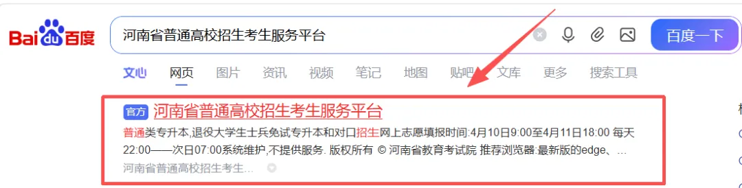 1.考生登录河南省普通高校招生考生服务平台(https://pzwb.haeea.cn/stu),或在搜索引擎中输入“河南省普通高校招生考生服务平台”,点击带有“官方”标识的网站。