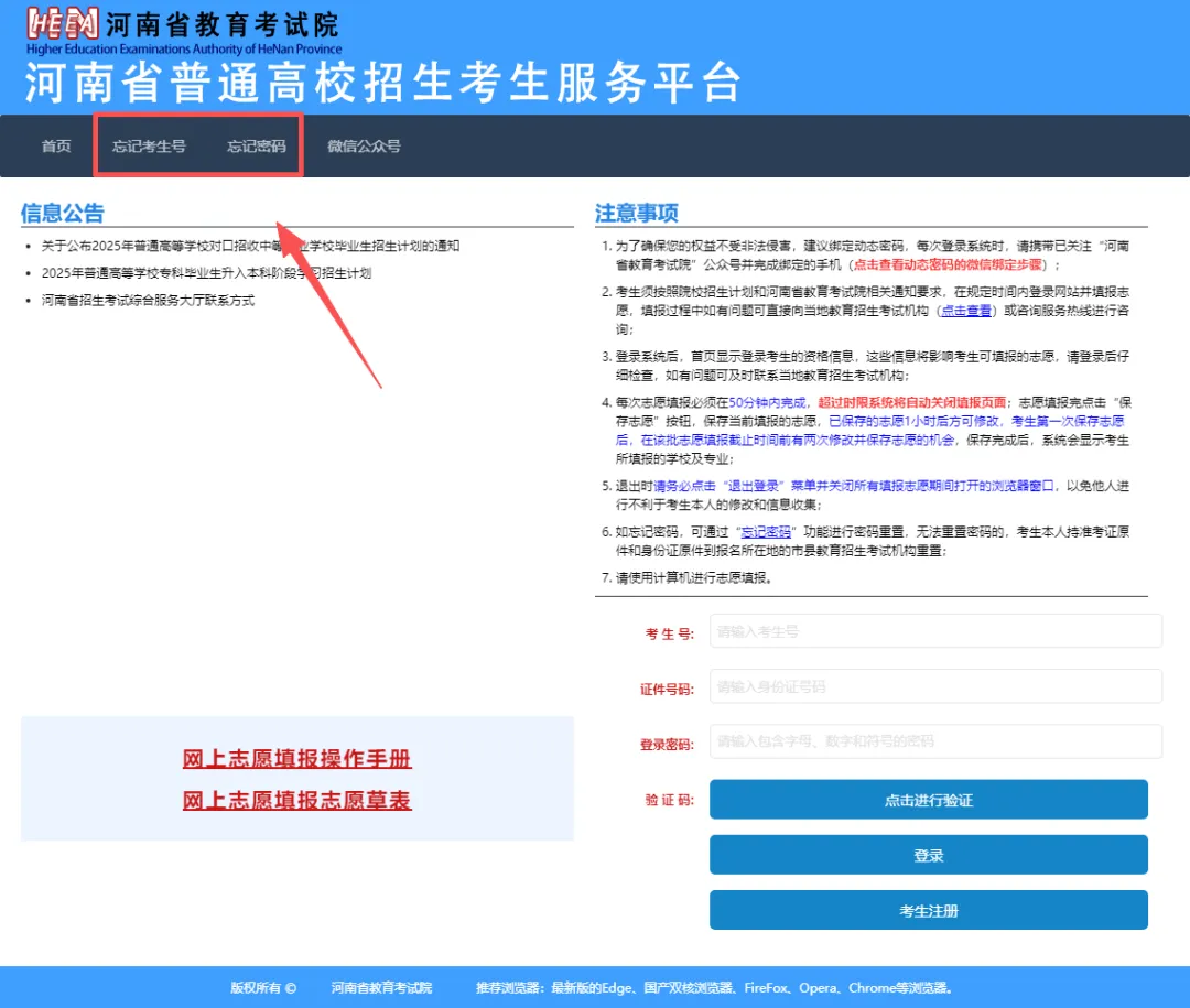 2.进入考生服务平台后,请仔细阅读“信息公告”区、“注意事项”区发布的政策公告和注意事项。