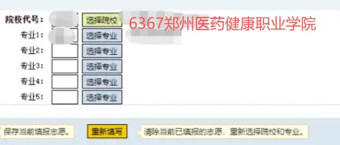 3.进入志愿填报界面,在院校、专业选择页面,考生点击所选志愿,系统会自动进行填写。(输入学校代号6367,自动显示“郑州医药健康职业学院”,输入两位字母的专业代号,系统自动会显示专业名称)。