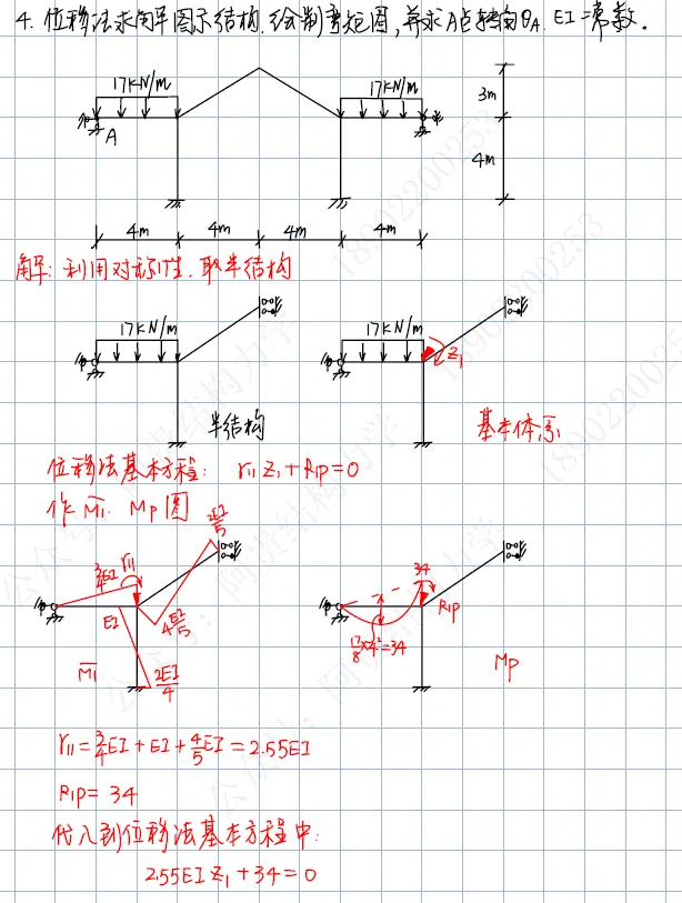第四题:利用对称性,位移法求解超静定结构,作弯矩图,并求转角;