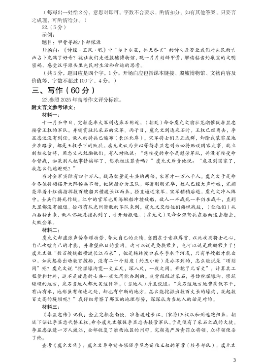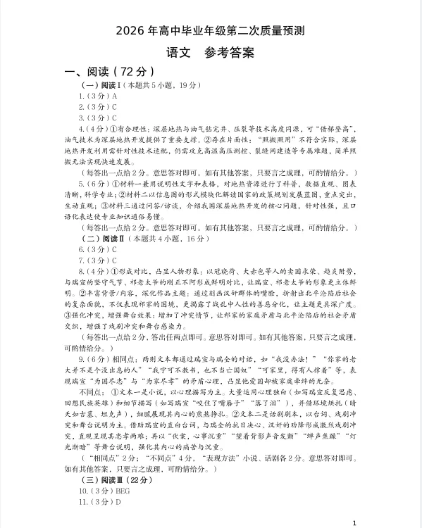 5.(6分)①材料一兼用说明性文字和表格,对地热资源进行了科普,数据直观、图表清晰,科学专业;②材料二以信息图的形式模块化解读国家的政策规划发展蓝图,重点突出,生动直观;③材料三通过问答/访谈,介绍我国深层地热开发的核心问题,针对性强,且口语化表达使专业知识通俗易懂。