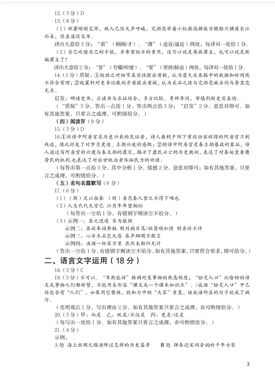 16.①刘诗中阿房宫是历史兴衰的见证者,诗人看到夕阳下曾经壮丽辉煌的阿房宫只剩残迹,借此抒发了对岁月更迭、王朝兴废的感慨;②胡诗中阿房宫是秦王朝暴政的象征,诗人通过写阿房宫的兴建与秦王朝的覆灭,揭示了虐民必亡的历史教训,表达了对秦始皇奢靡劳民的批判,也表达了对后世统治者体恤民力的劝谏。(每答出第一点给3分,其中分析1分,情感2分。意思对即可;如有其他答案,只要言之成理,可酌情给分。)
