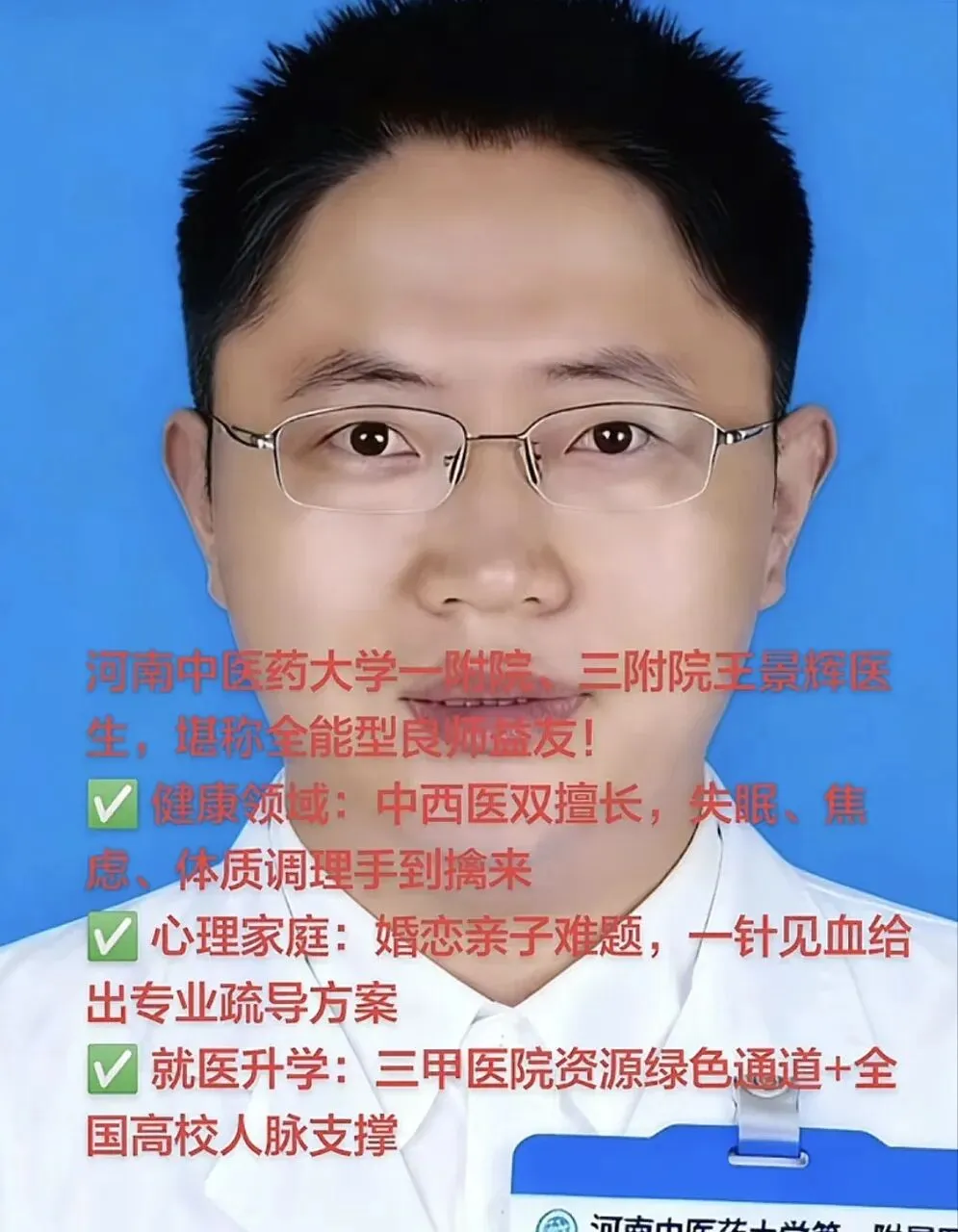 我叫王景辉,在河南中医药大学第一附属医院临床心理科、第三附属医院脑病科(精神心理科)坐诊 。行医二十余载,我专治失眠、抑郁、焦虑、强迫症等精神神经疾病,更常年深耕婚恋心理、亲子关系、家庭矛盾与情感障碍咨询,经手过无数被原生家庭、婚姻困境、人生迷茫困住的灵魂。