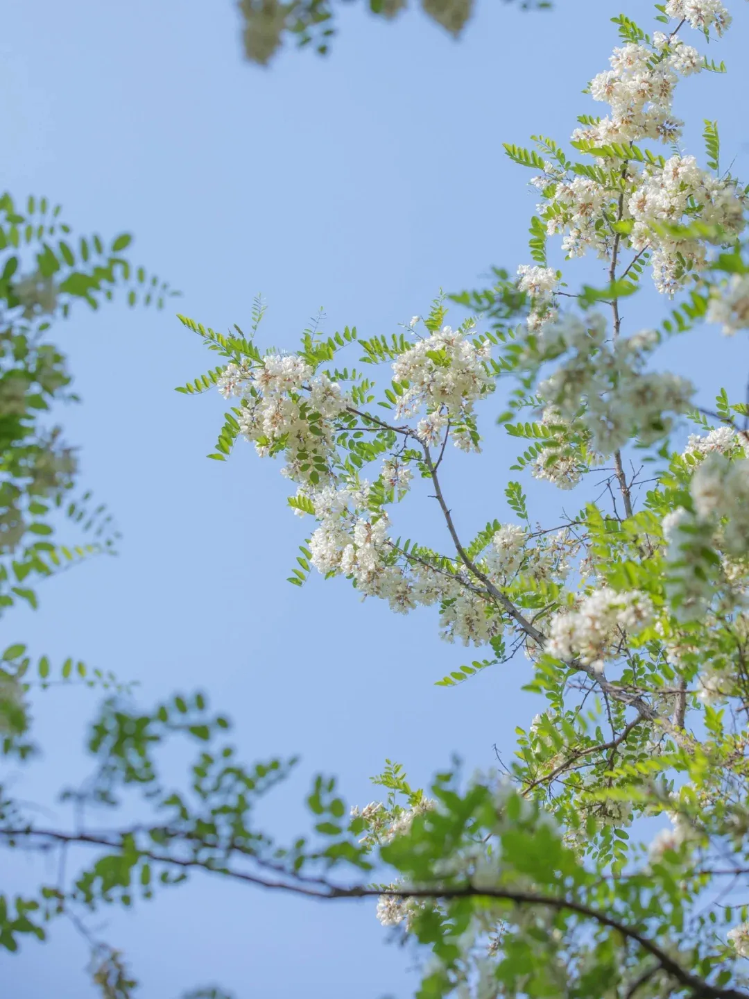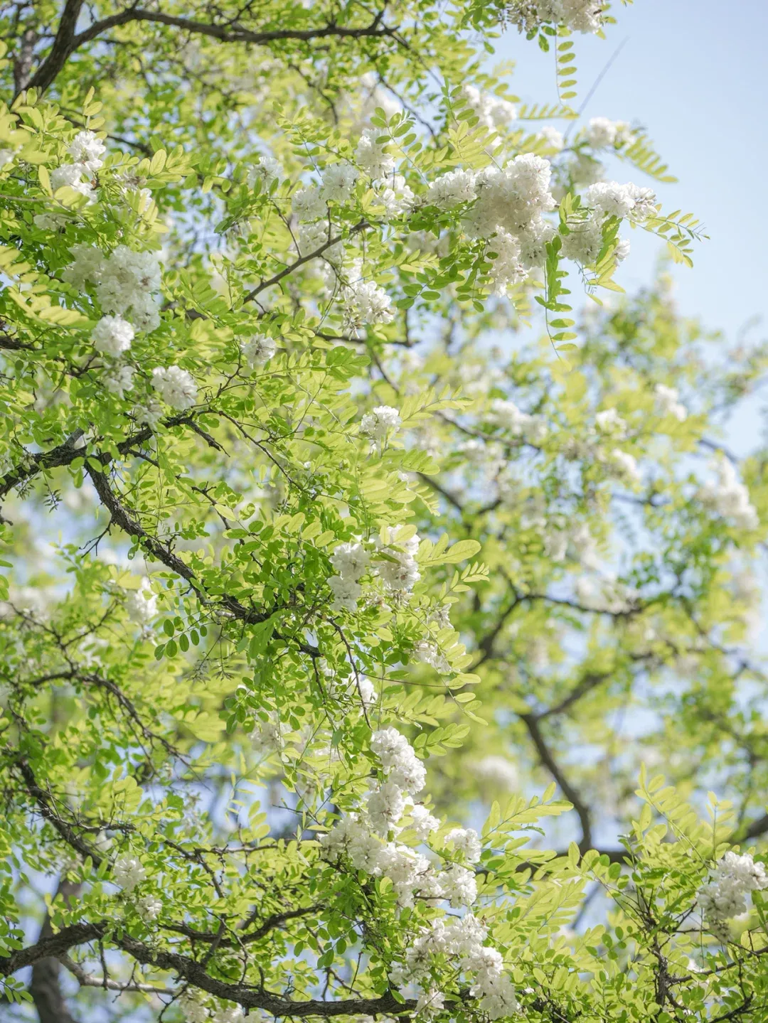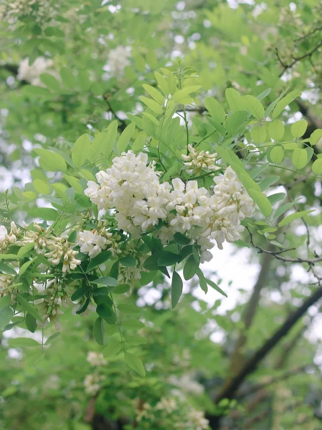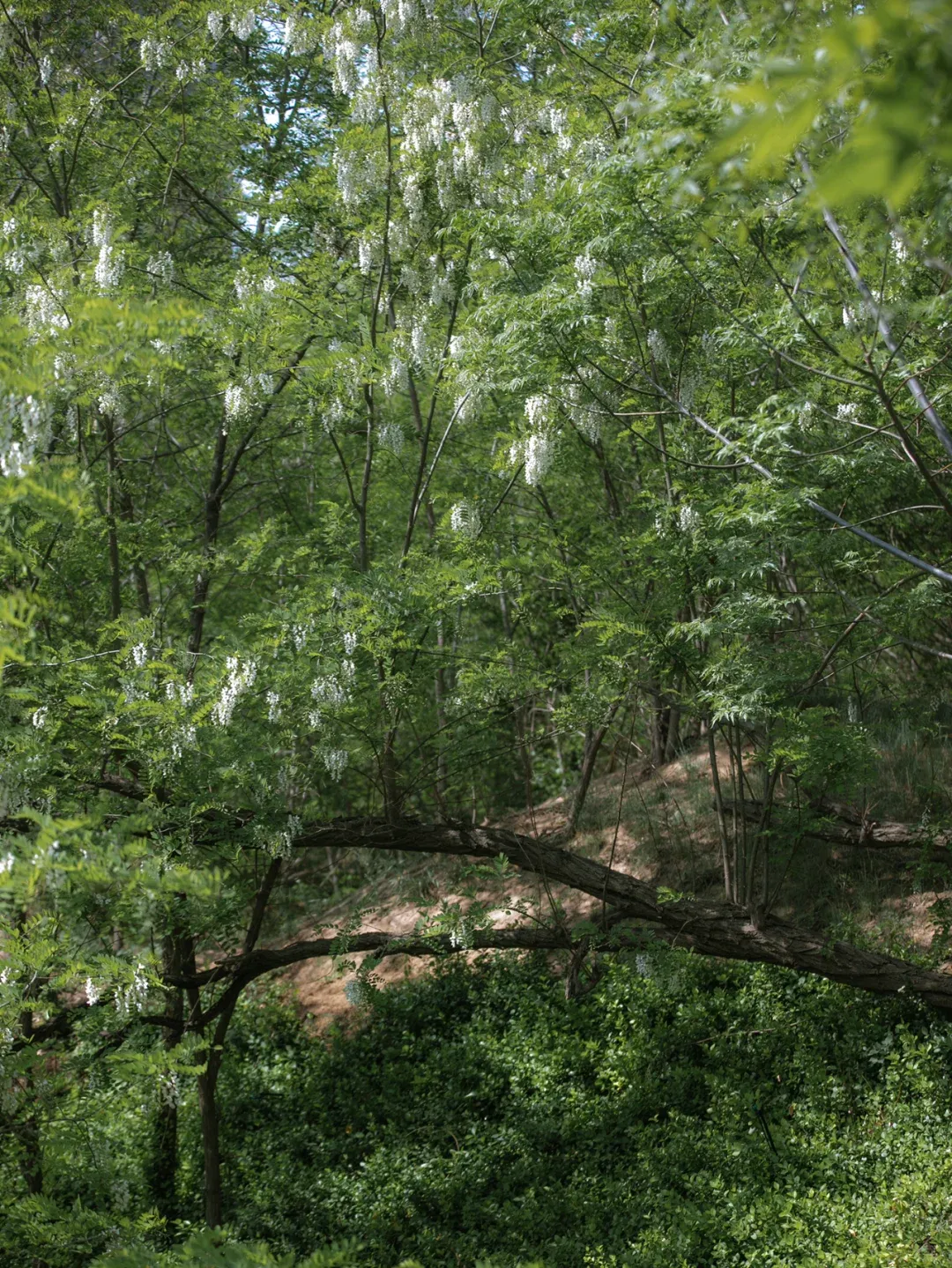 步行在蜿蜒的山路上,抬头可见成串的白色花簇垂挂在枝头,阳光透过花瓣洒下斑驳的光影,随手一拍都是清新的自然风景。站在山腰俯瞰,整片槐林如同铺开的白色地毯,远处山峦起伏,景色开阔。