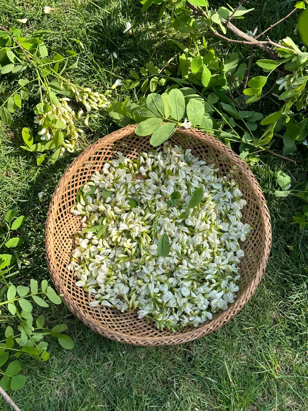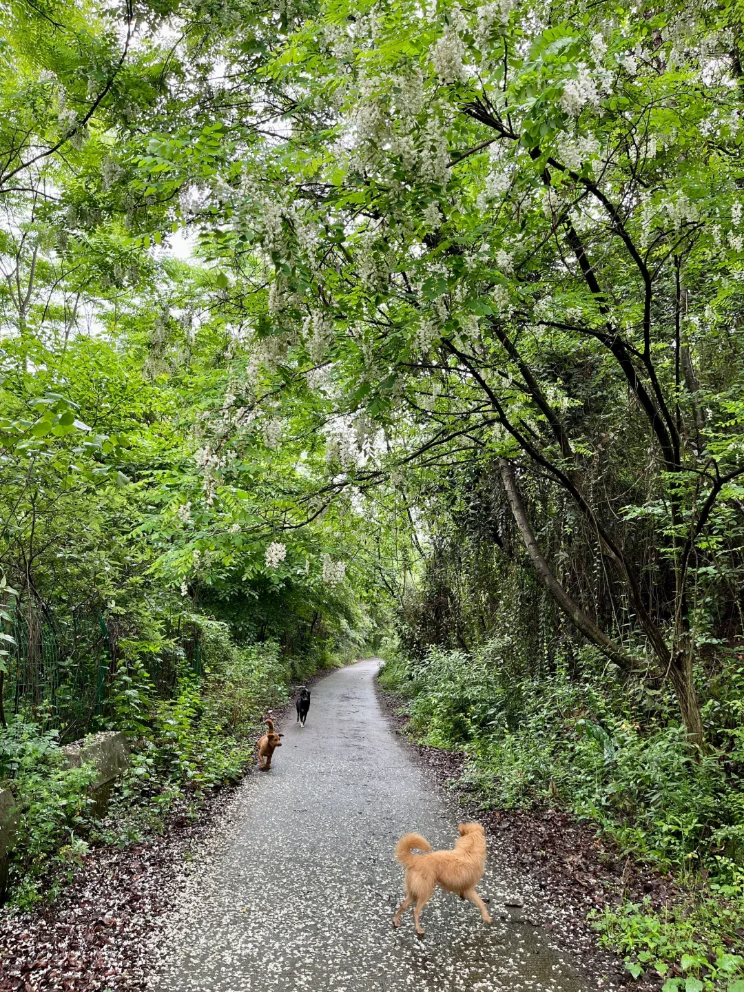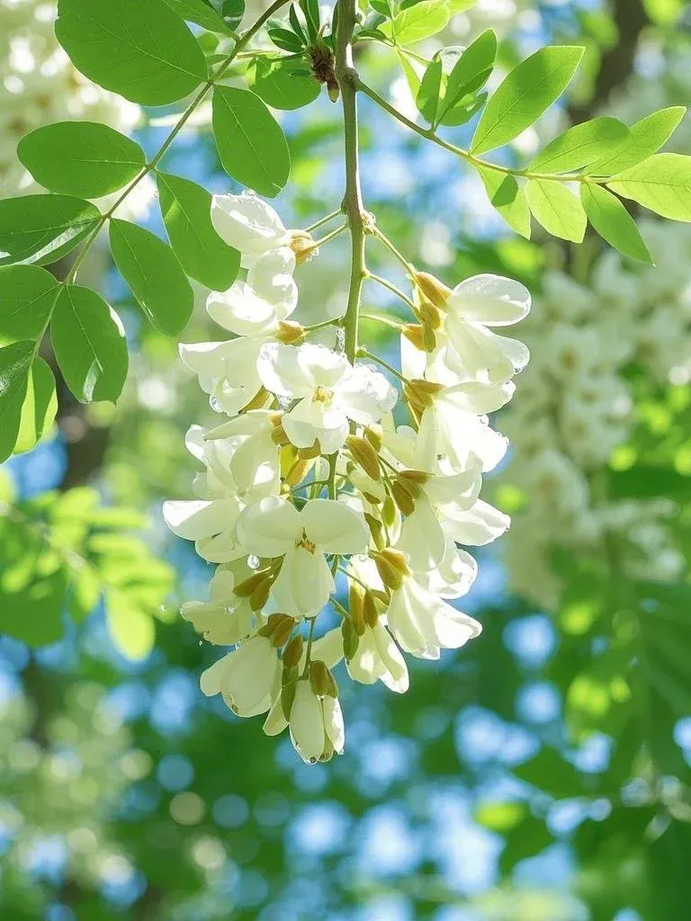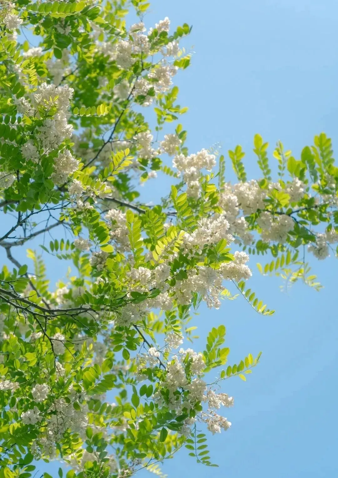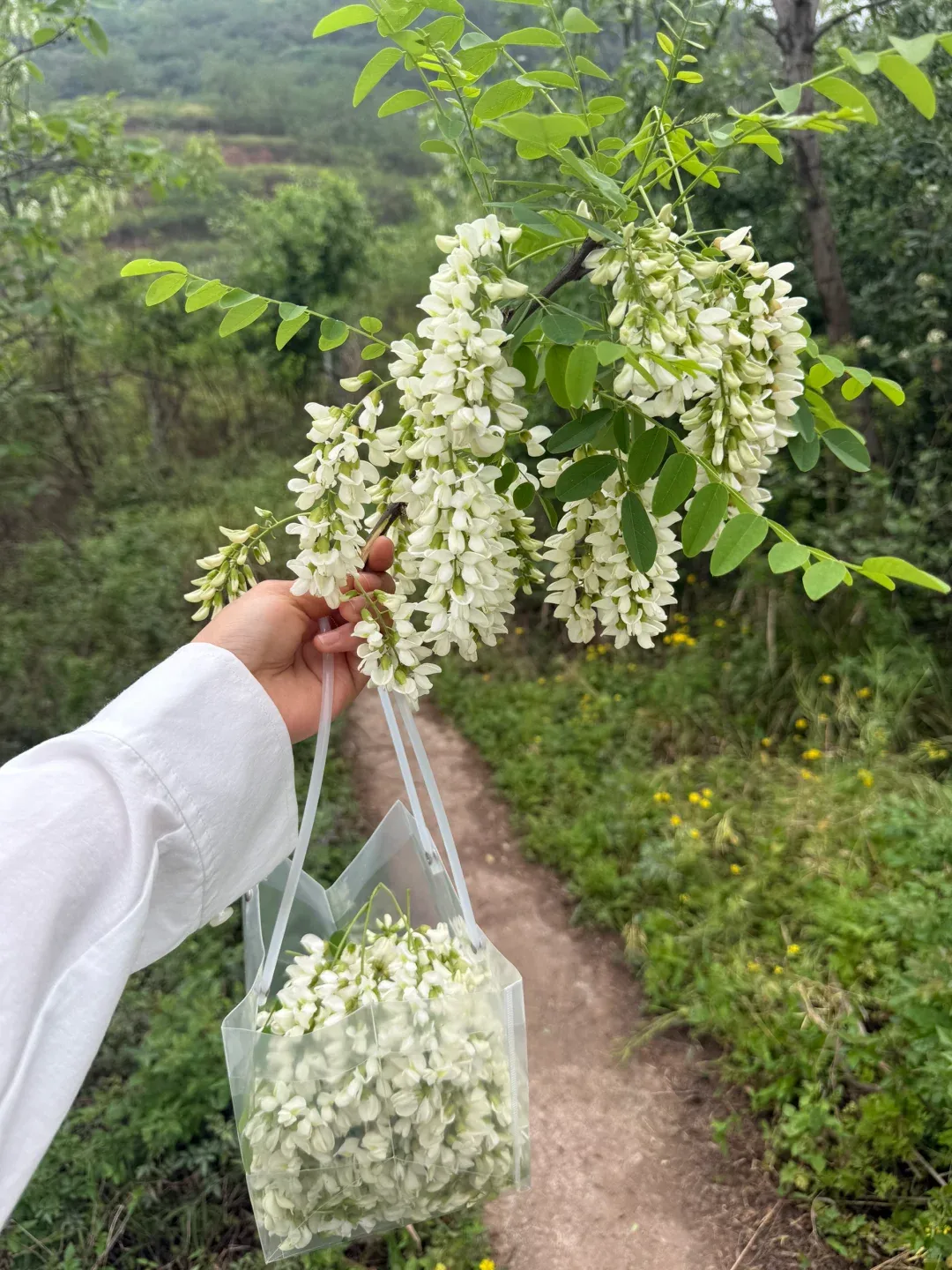 步行在蜿蜒的山路上,抬头可见成串的白色花簇垂挂在枝头,阳光透过花瓣洒下斑驳的光影,随手一拍都是清新的自然风景。站在山腰俯瞰,整片槐林如同铺开的白色地毯,远处山峦起伏,景色开阔。