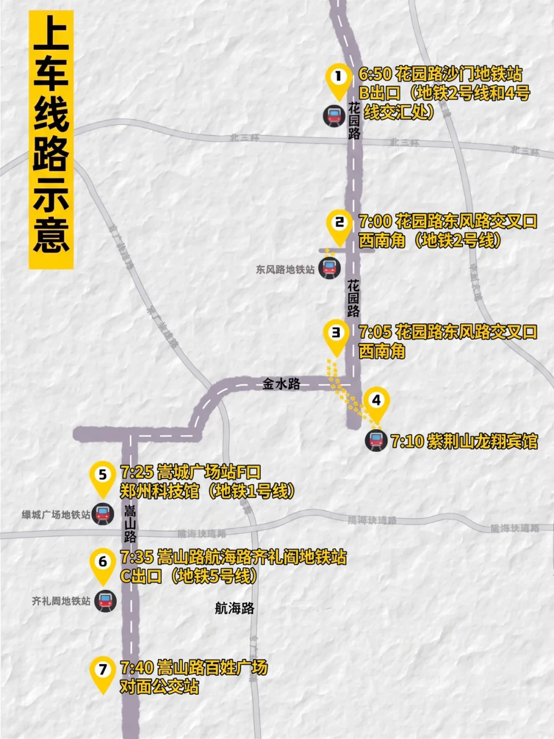 7:30 嵩山路航海路齐礼阎地铁站C出口(地铁5号线)
