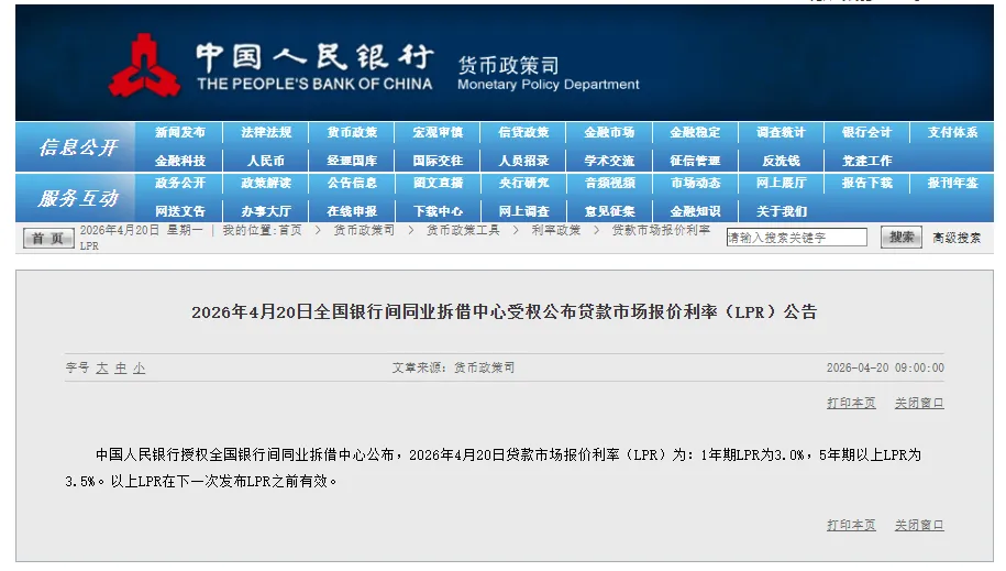 中国人民银行授权全国银行间同业拆借中心公布,2026年4月20日贷款市场报价利率(LPR)为:1年期LPR为3.0%,5年期以上LPR为3.5%。以上LPR在下一次发布LPR之前有效。