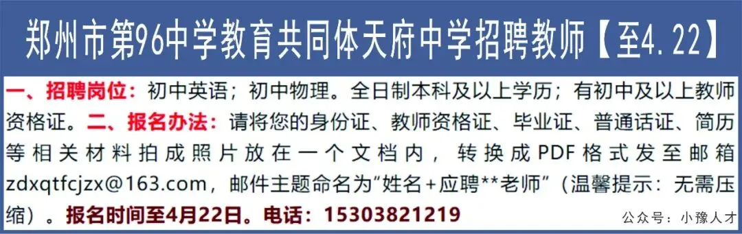 郑州市第96中学教育共同体天府中学招聘教师【至4.22】
